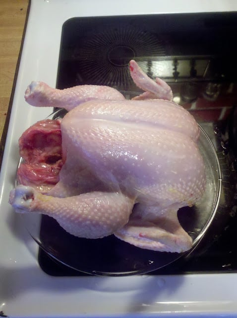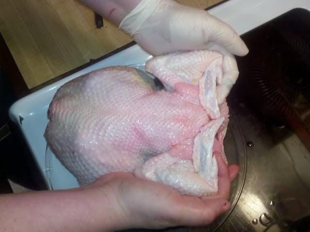 One last step is to remove the kidneys. I find the easiest is to "scramble" them with my finger, they are buried almost in the back bone. When I wash the bird, I'll flush the bits out with water.
