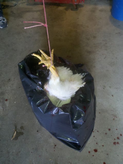 I do one fast slice, and then lower the chicken into a contractor bag inside a bucket that has some heavy stuff in the bottom. This way, they are placed in the dark, they don't struggle, and they will pass away without panic. At the end of their life, when blood loss is nearly complete, muscle spasms will occur. The bucket keeps blood and whatnot contained.
