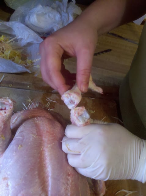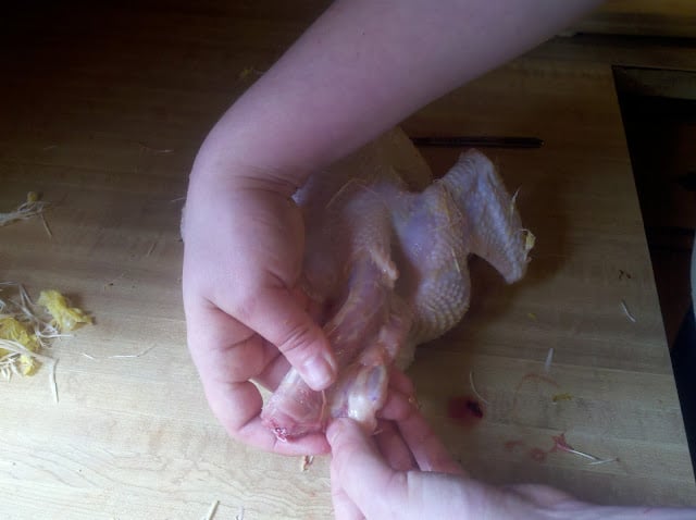 The wing feathers are little, just slide them off. I don't do a perfect pluck, just get the majority off. I will do a final go over when I wash the bird after gutting.