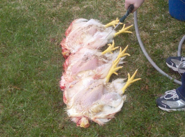 I keep my scald water on the stove, in an old water bath canning pot. I fill about 2/3 full, and then squirt in a good squirt or two of dish soap. This helps work into the feathers to loosen, and also keeps the smell down. I find the prewash with the hose helps heat transfer, so I lose less heat when scalding, which means less time to bring the water to temp. I aim for about 150 degrees, and check the water temp between birds.