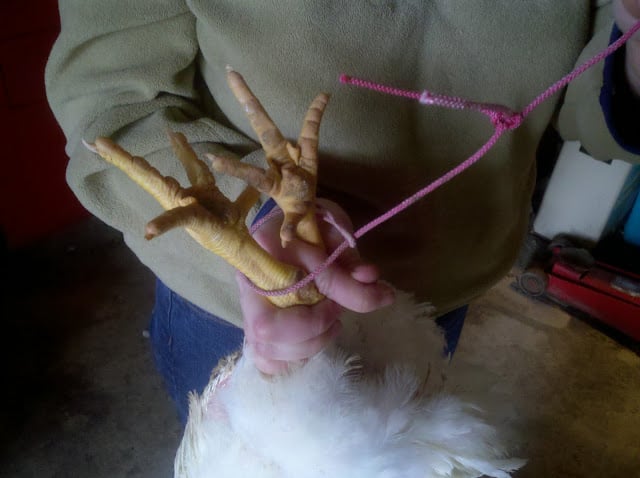 First step not shown is getting your chicken. These guys are lazy and don't really run much. Pick them up and carry them to your designated slaughter spot. My spot is in the garage, with a rope hung from a gambrel pulley. The rope has a loop at the end, which I double around to make a noose of sorts that slides easily. I place the chicken's feet in the noose, and gently lower them to hang. Chickens will stop struggling and hang limp when upside down.