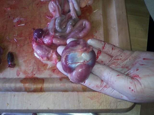 I'm holding the gizzard. This is the big and HARD thing in the gut cavity. It's hard to mistake it for anything else.