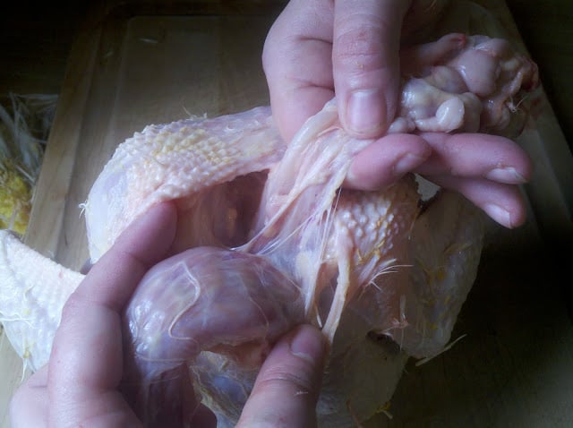 Turn the chicken over, and separate some of the skin off the breast. The crop is stuck to the skin and the breast meat. Work it off both, so there is a sack attached to the esophagus, and then the tubing going into the body.