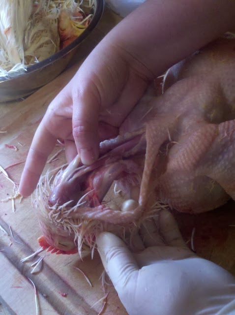Peel the skin off the neck and the "tubing", and then cut off the neck skin with the head attached. Leave the tubing to keep food from coming from the crop out.