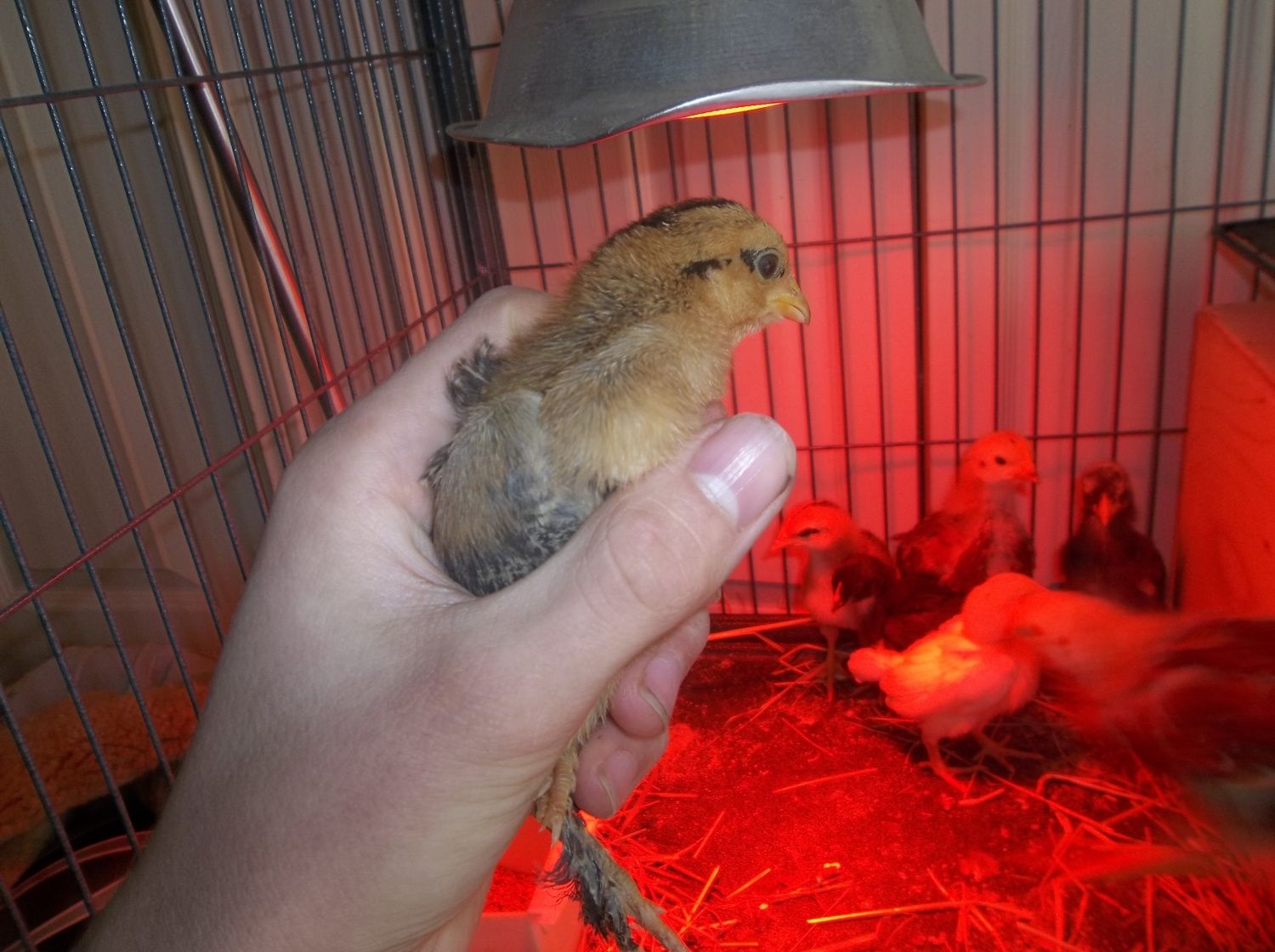 This one is really skittish. It has some feathers now and they are all the same color as the chick pictured. This chick has greyish legs and either a pea or rose comb.