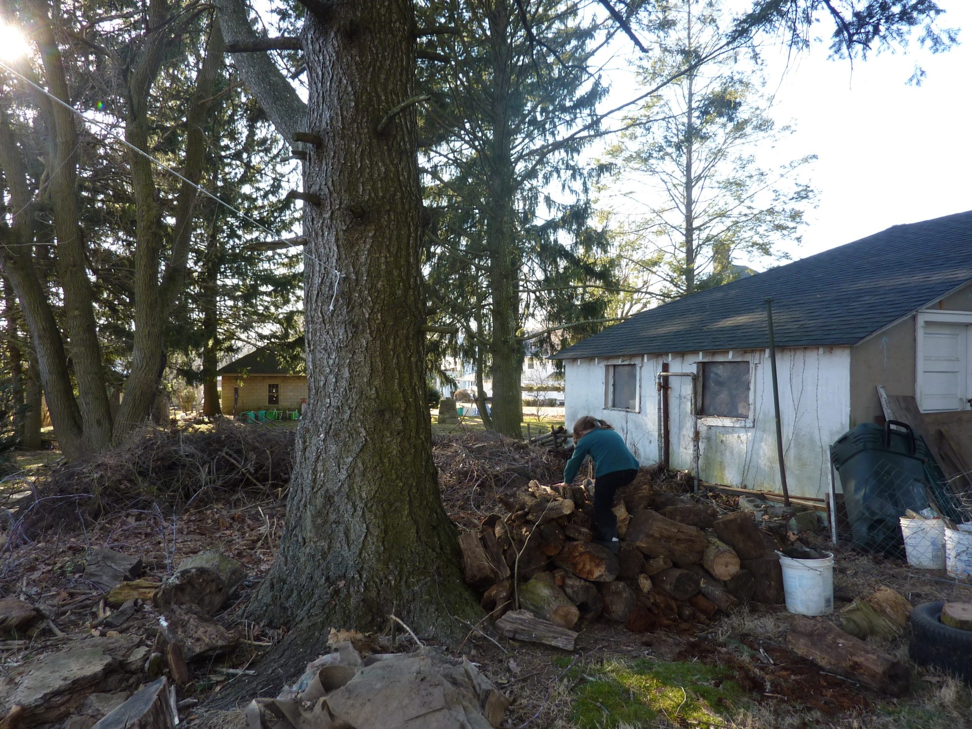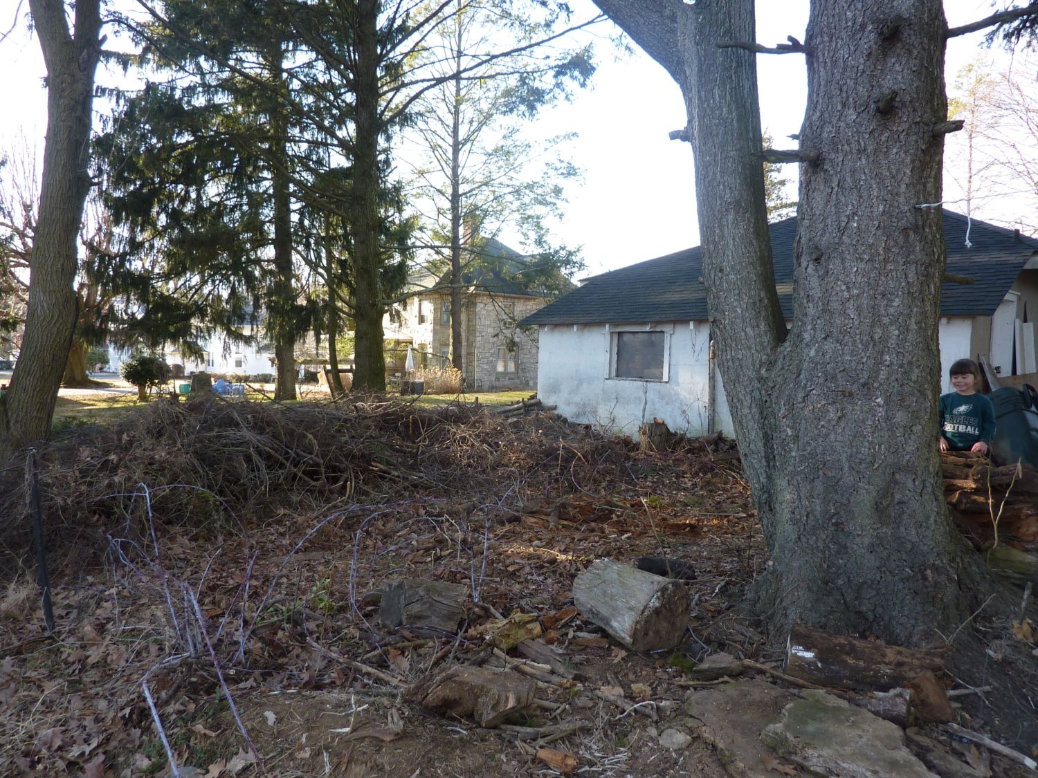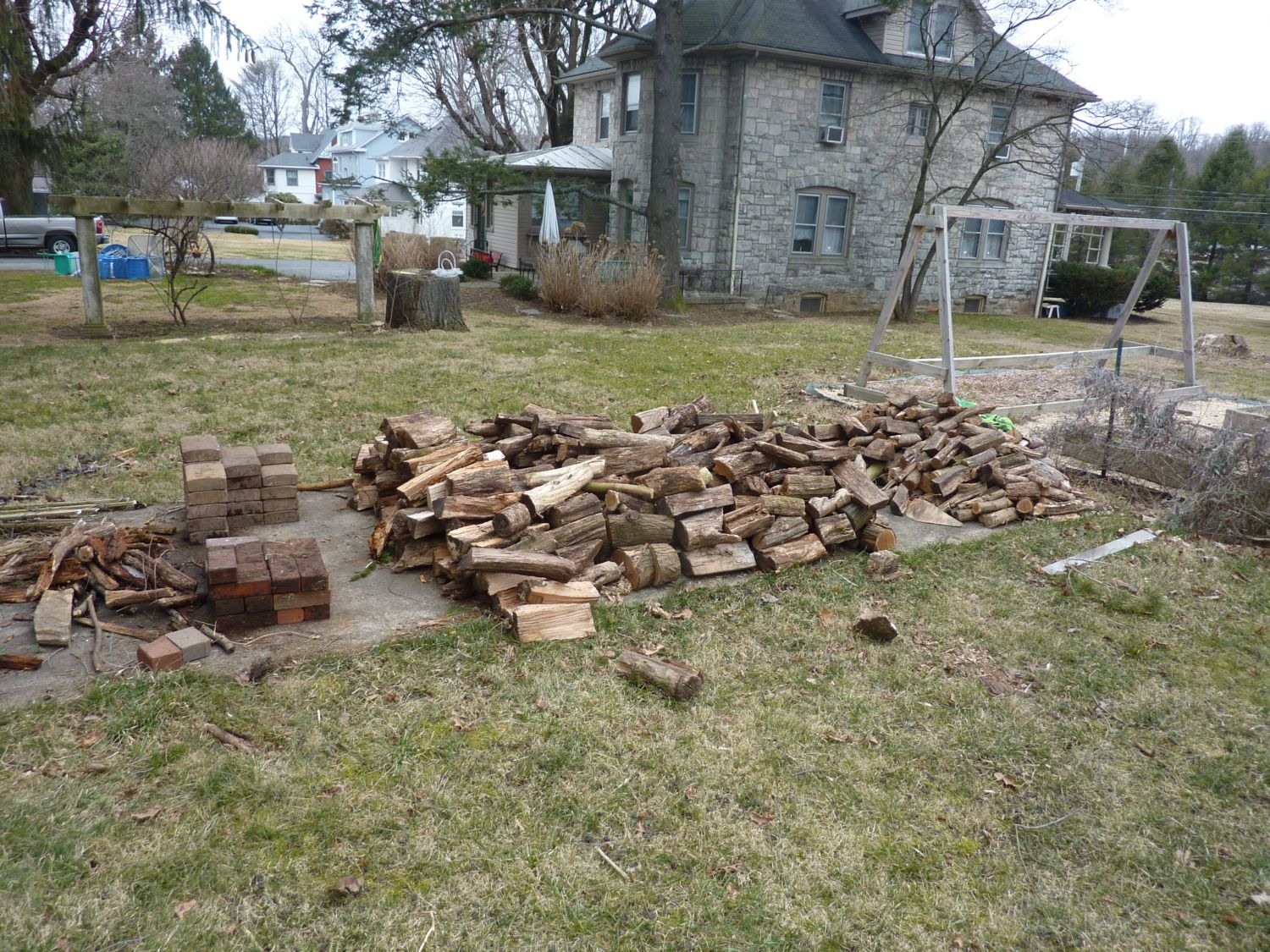 After one day of work. The center part right behind the garage was mostly large logs. Peter chopped a ton of them into manageable pieces. The pile next to the tree is what still needs to be cut and split.