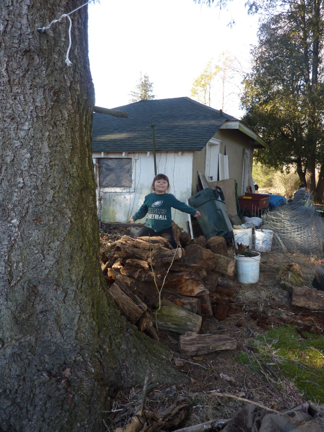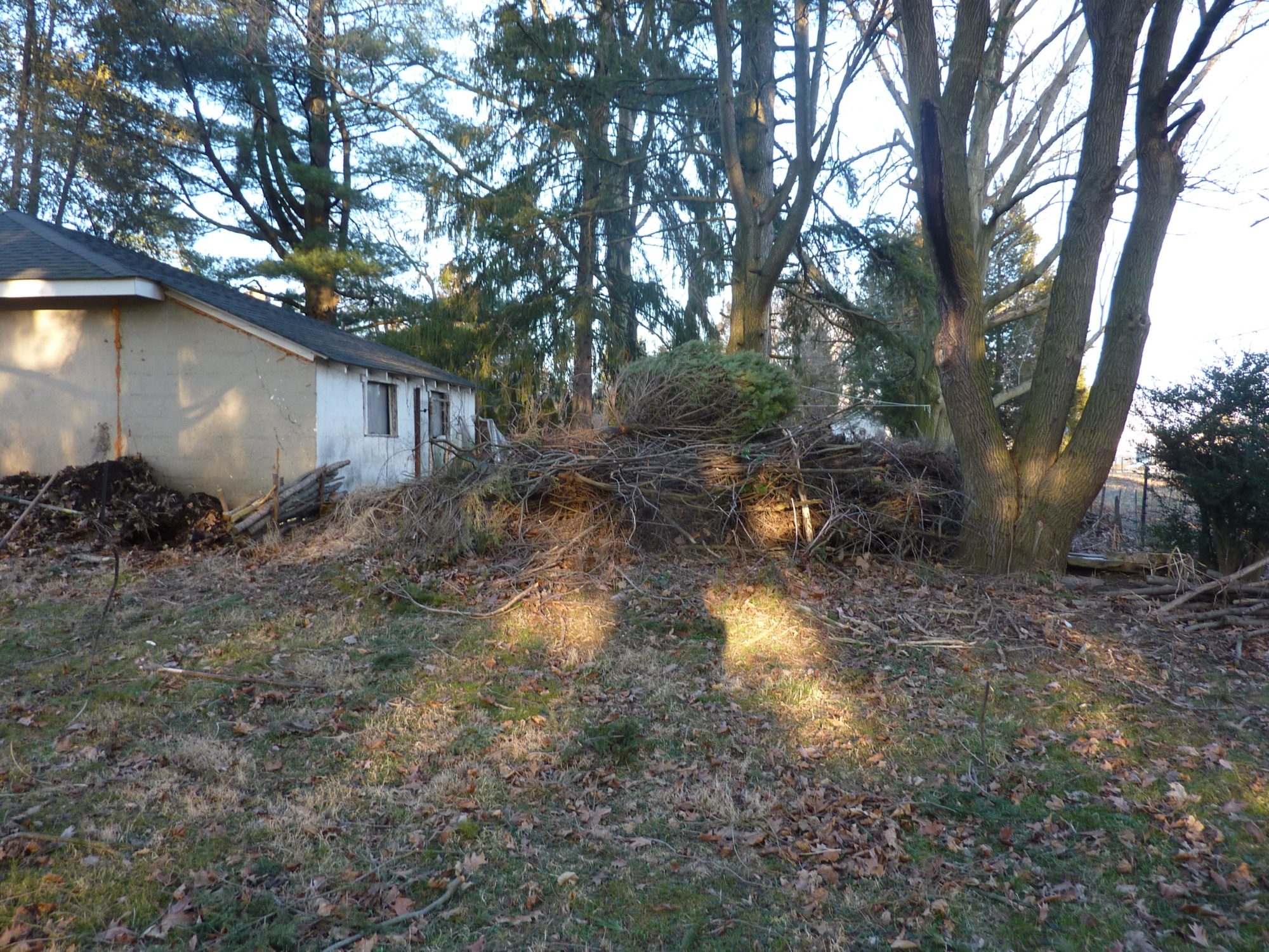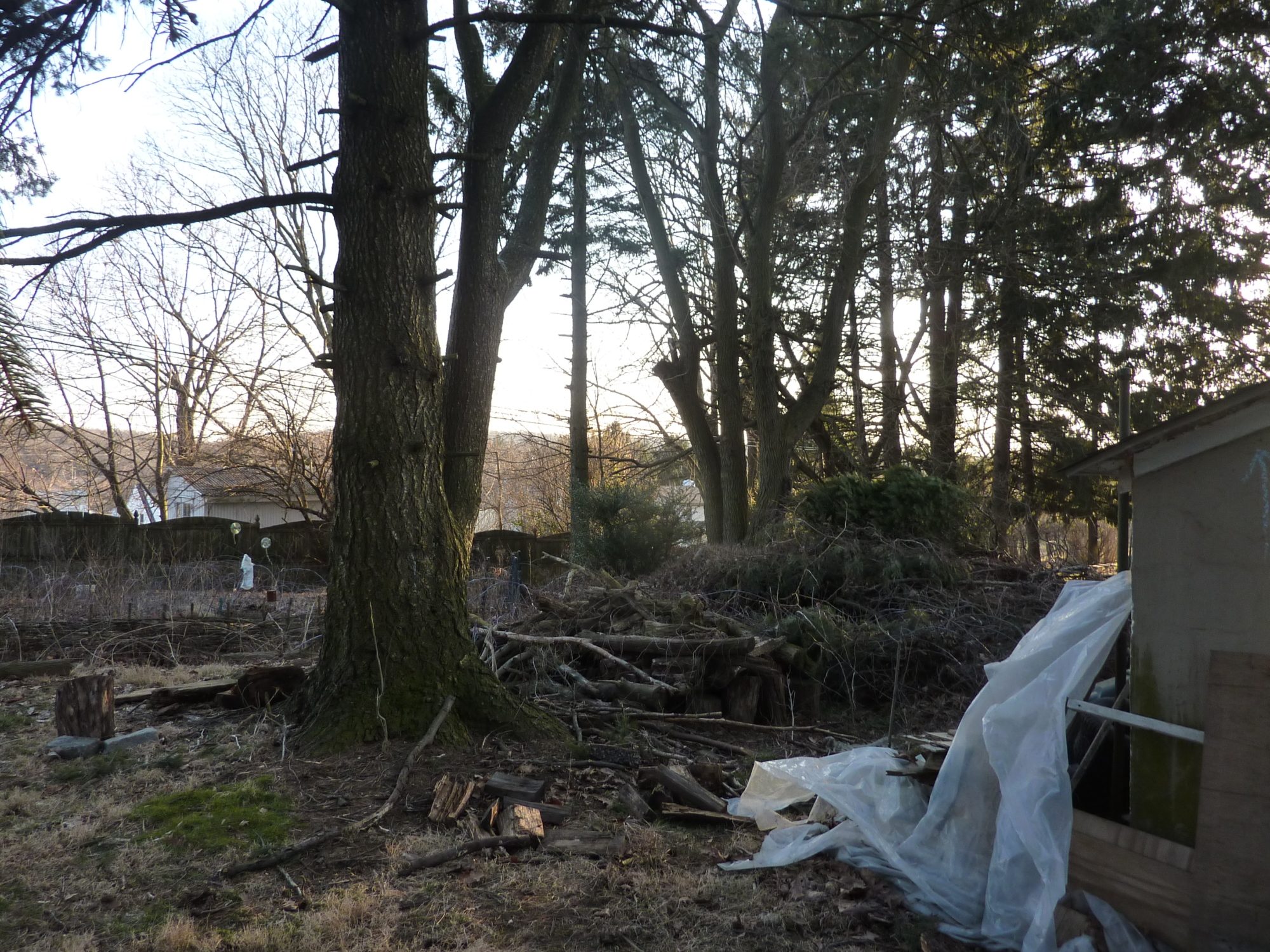 After one day of work. The center part right behind the garage was mostly large logs. Peter chopped a ton of them into manageable pieces. The pile next to the tree is what still needs to be cut and split.