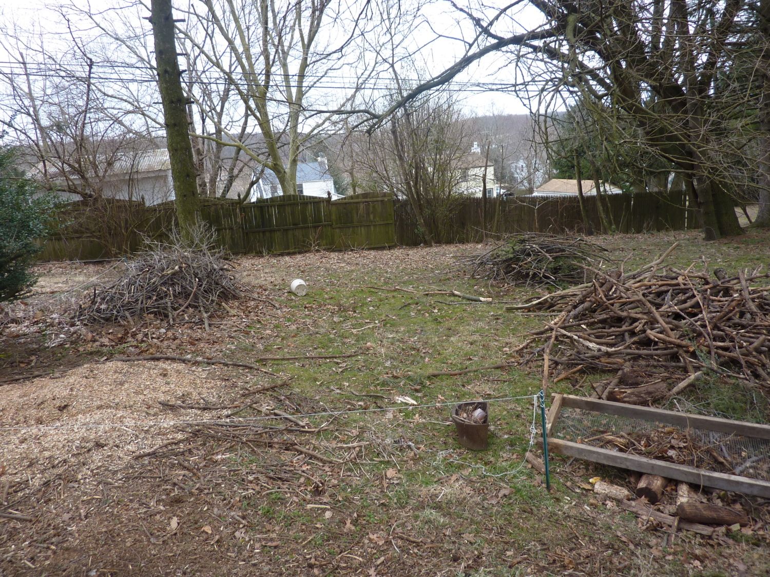 This brush pile was here when we moved in, although we've certainly been contributing to it. We have a lot of trees which just LOVE to dump sticks on the lawn. And for some reason, my husband thinks we should save our Christmas tree instead of letting the town take care of it. Unfortunately, that massive pile of sticks was exactly where I wanted to put the coop.