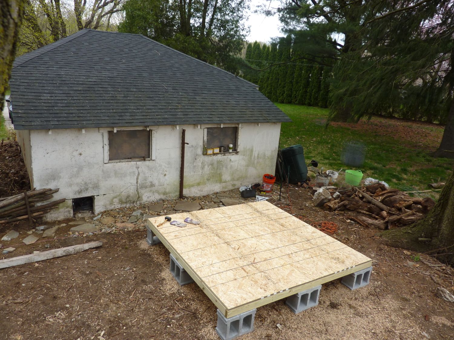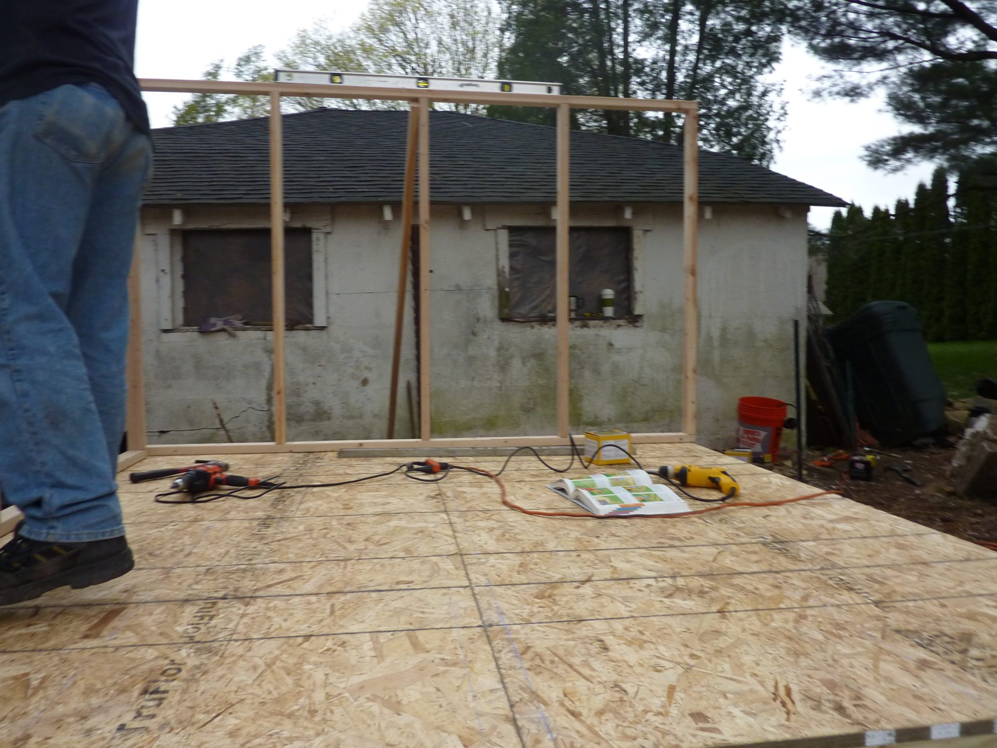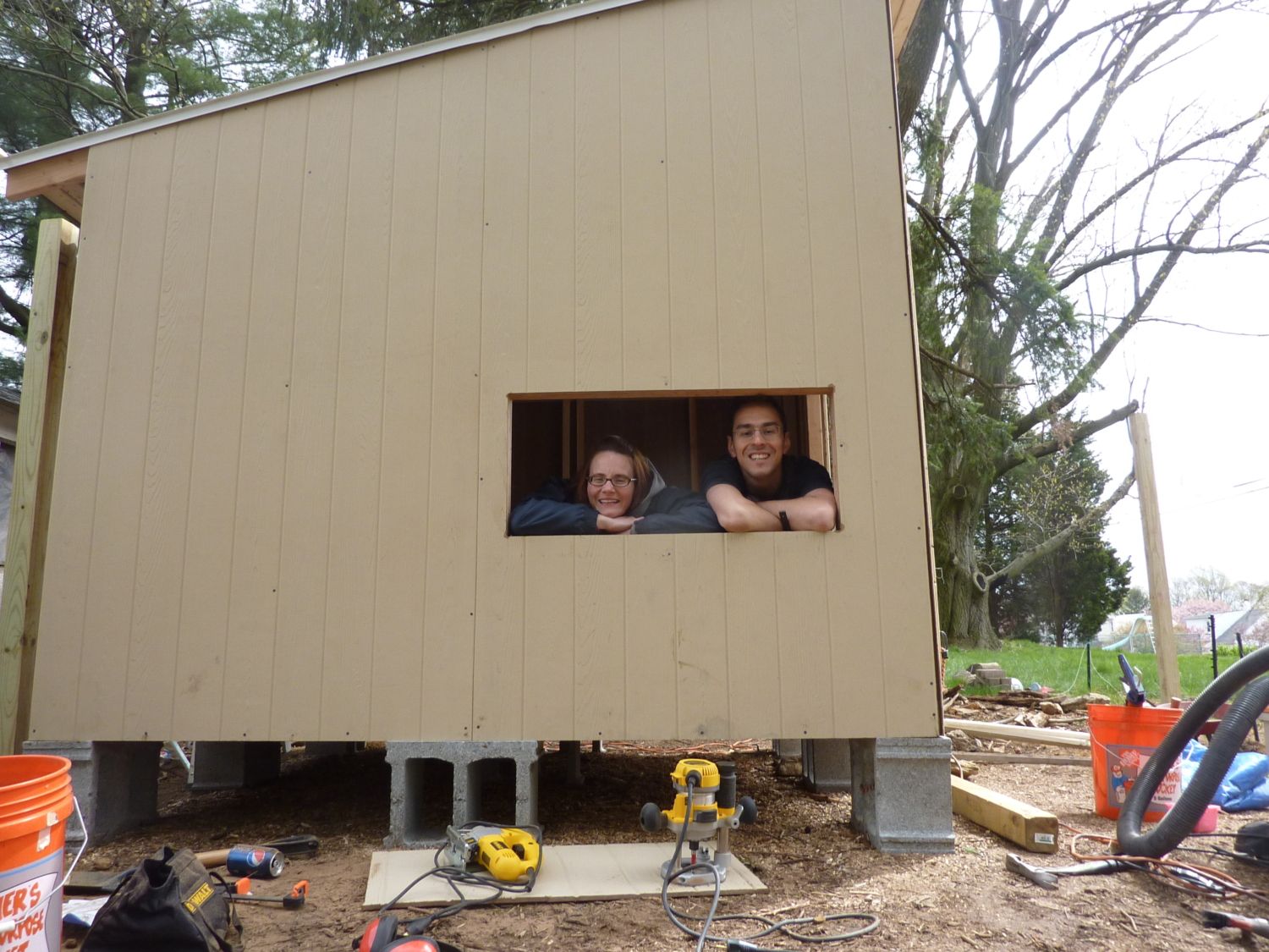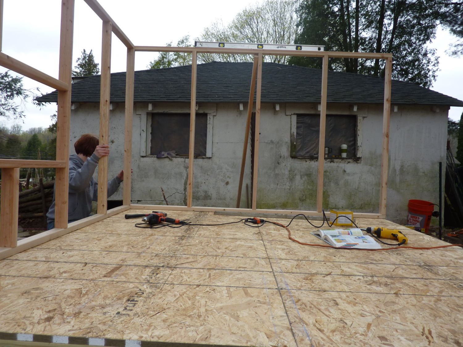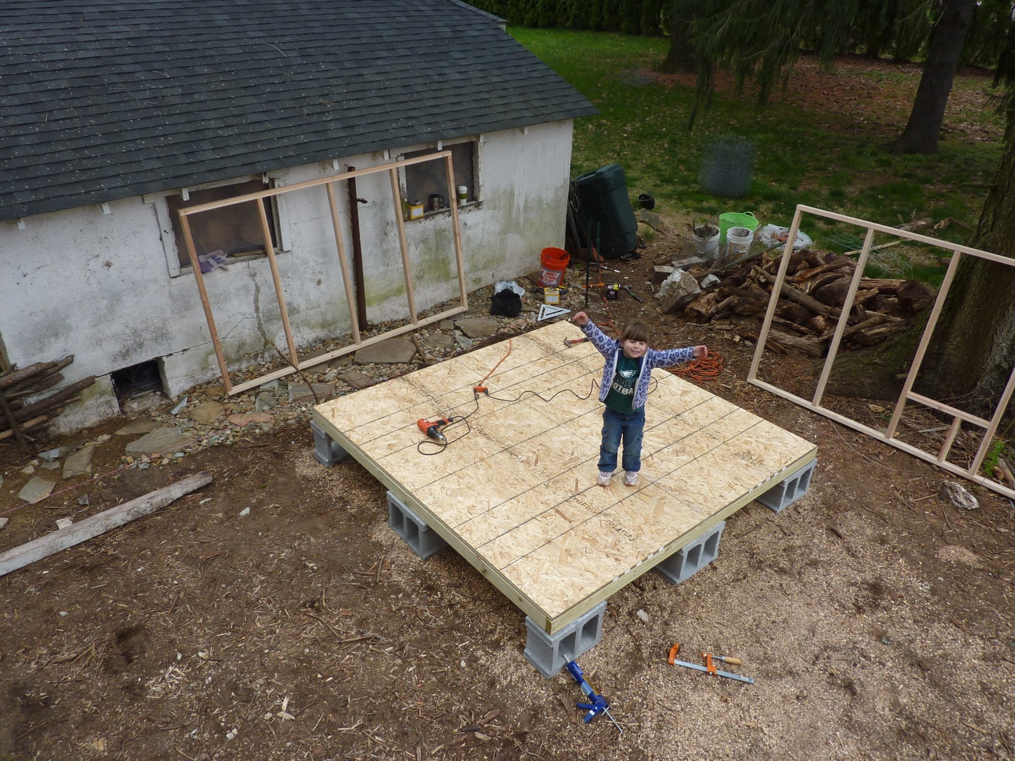 We started the day by laying down the flooring, which we promptly pulled back up because my husband wanted to Liquid Nails it before we screwed it down. That accomplished, we screwed while our daughter documented the process.