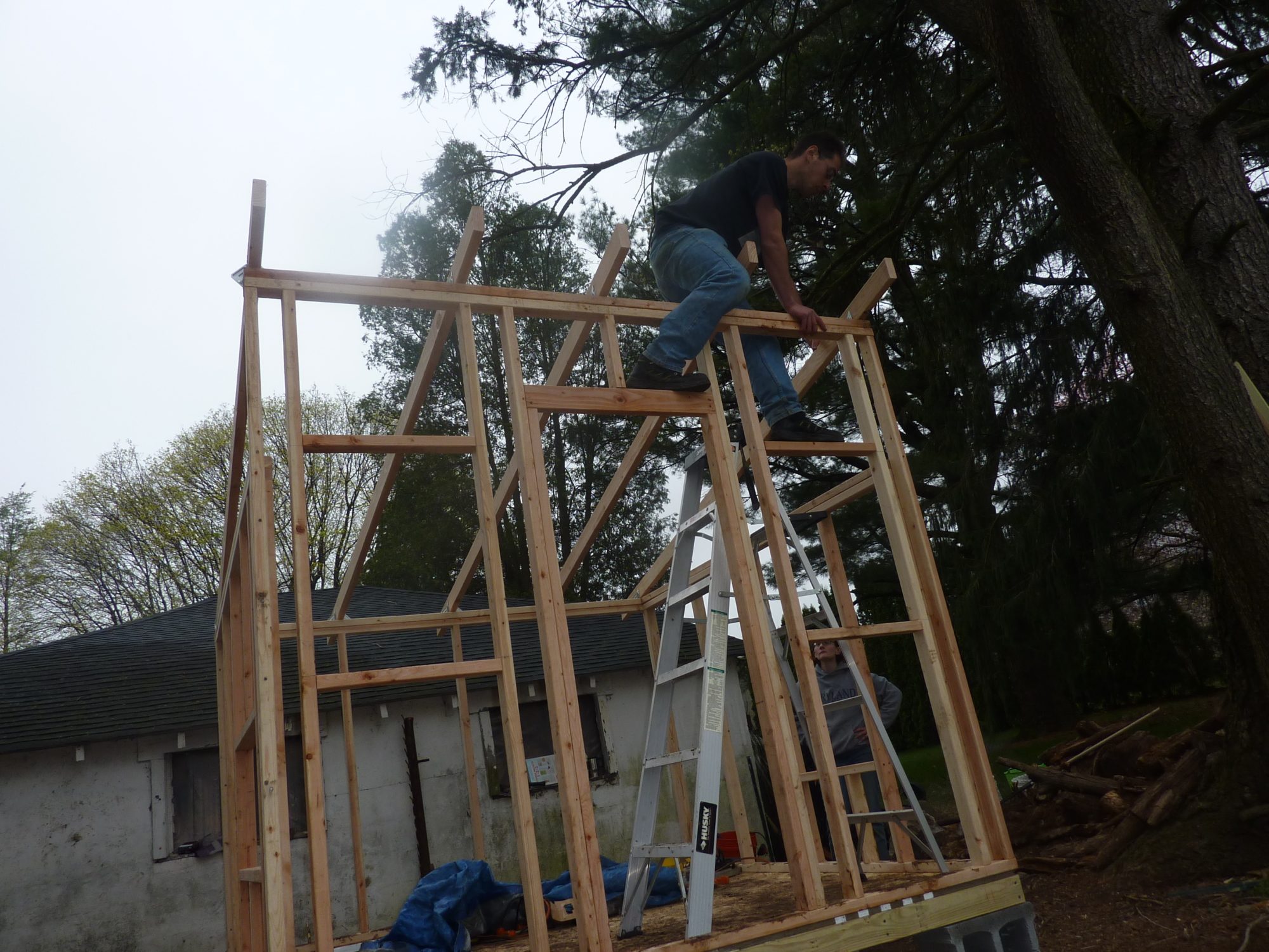 Rafters and purlins up. Unfortunately we had to stop before we actually got the roof on, so the whole shebang got wrapped in tarps for a couple of days.