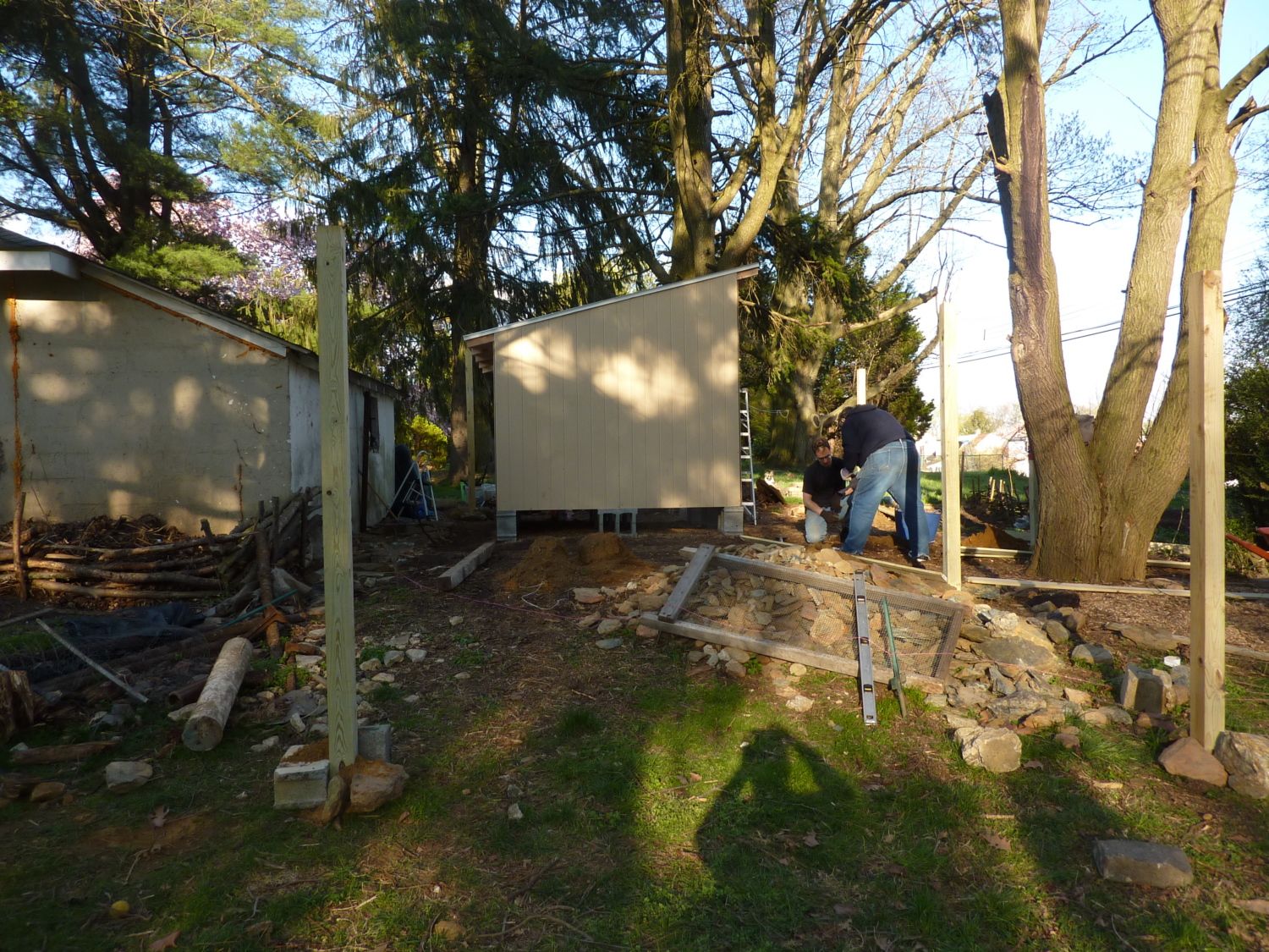 The chicken yard fence with be on the right side of the 4x4 on the ground. We want to have a walking/drainage path to the left of it. Peter dug down a good 18 inches or so to take out some random jungle gym pieces and a huge old stump, then started filling back in with large rocks. The fieldstone pieces were all buried under the brush, probably left over from the patio that the previous owners installed. We're going to lay them for the path, with gravel around them.