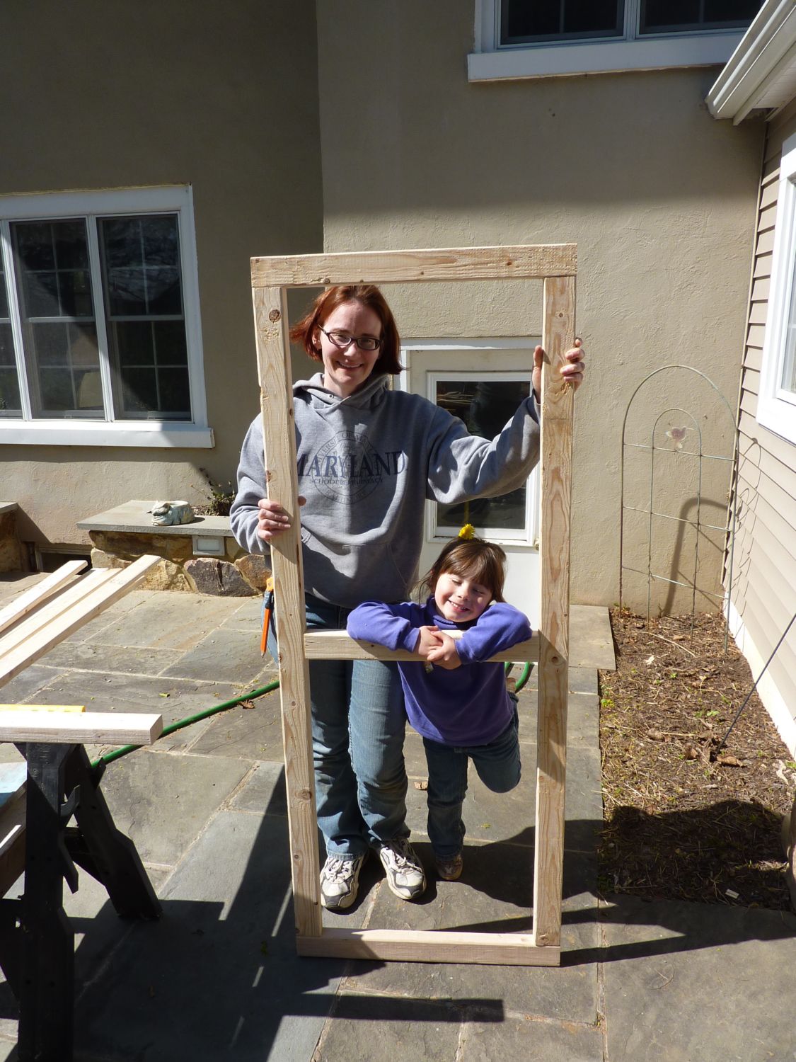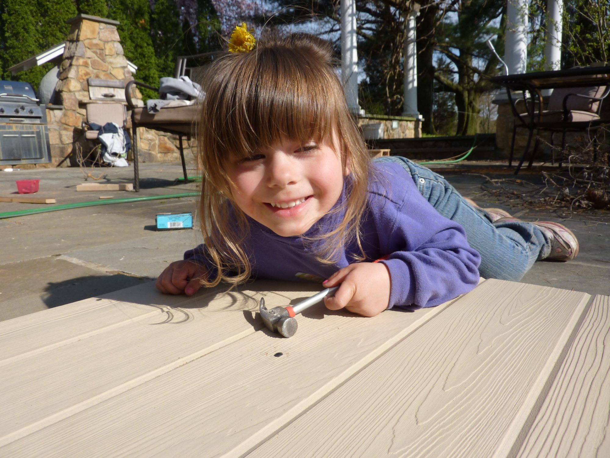 Gabriella has her own tools. She wants to use her 4 oz hammer to help with the door.
