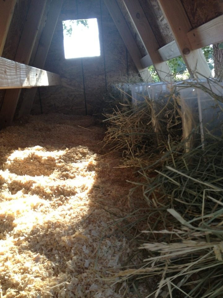 The coop required 4 sheets of OSB plywood, and 8 foot 2x4s. As you can see from the pictures, we made doors on the side to open for the nests. Inside there is plenty of room for the roost on one side and the nests on the other. Underneath the coop provides shade during the heat of the day, and during the cold days, we've enclosed the space underneath so the girls can get out of the elements. The nests are inexpensive plastic tote boxes from Walmart so they can be washed out easily when I clean the coop.