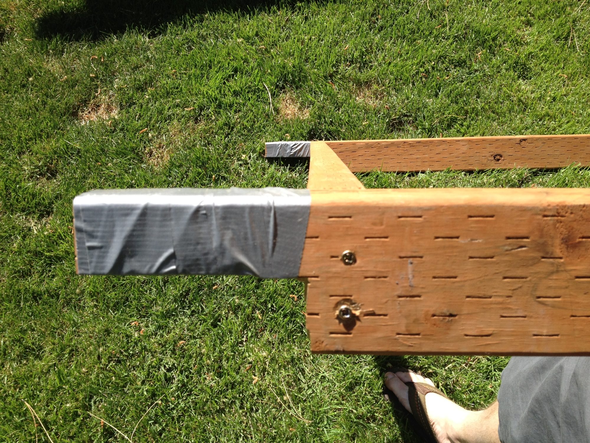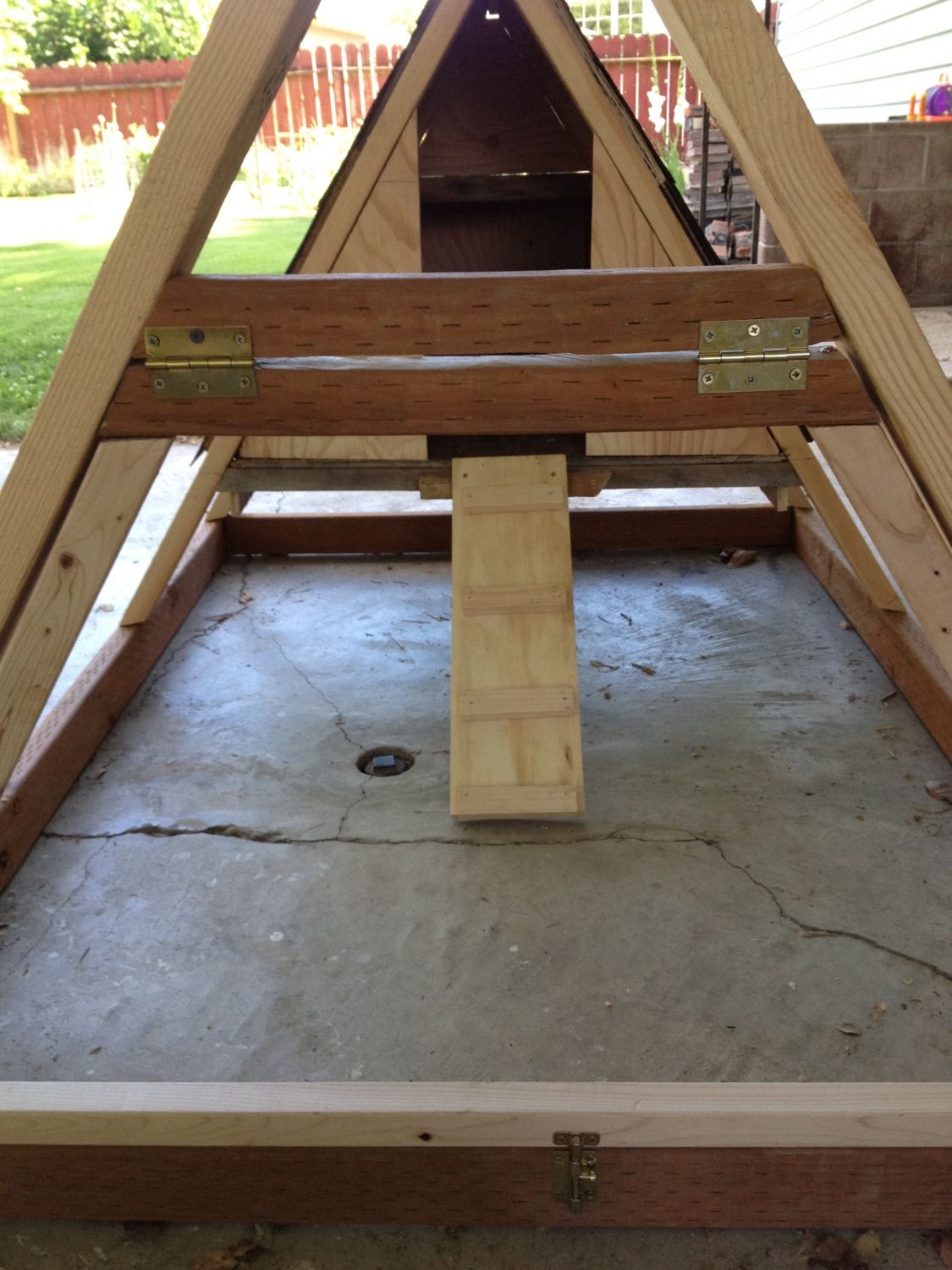 This A Frame tractor is designed for 3 to 6 chickens. The footprint is six feet by four feet, for a total of 24 square feet. I built it without a plan. It's pretty simple, and is roughly based on similar designs to what I've seen on BYC. Cost to build was about $80. I already had the shingles and a bit of scrap wood on hand, which helped to keep the cost down. It has a large door on one side of the A, and an egg door on the other side. The wheels are 5 inch (solid), and are bolted to the back 2x4. To move it, you lift up the front end by the handles, and lift it like a wheel barrow. It's too big of a reach for one child to move, but an adult can do it alone with a little bit of work. The enclosed roosting area is about a foot off the ground, and is roughly 2.5 feet by 3 feet.