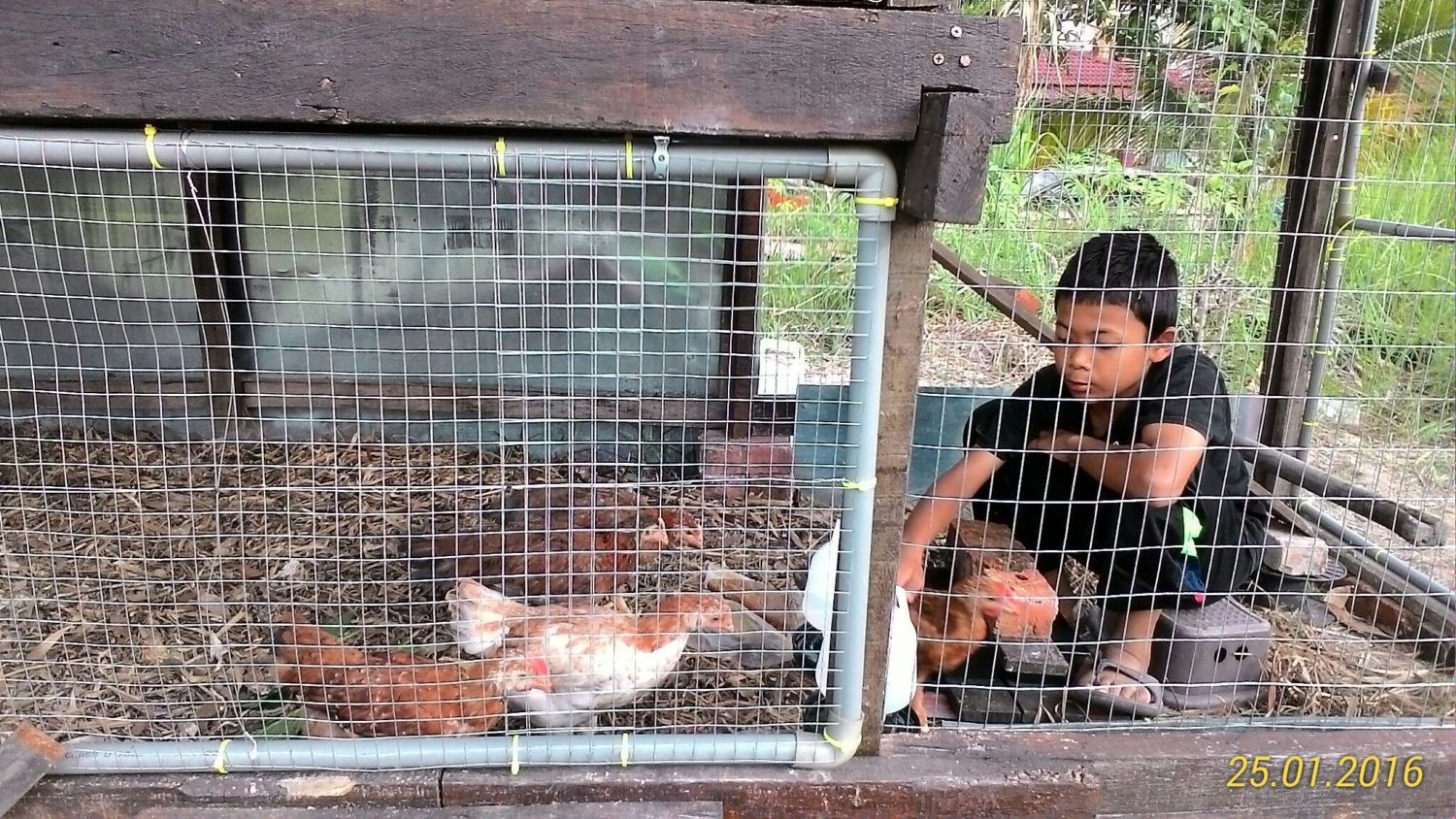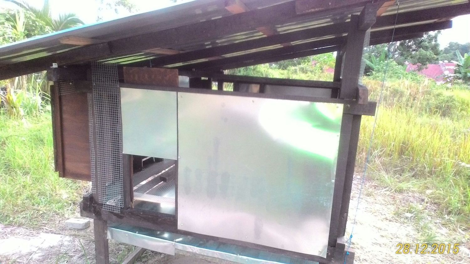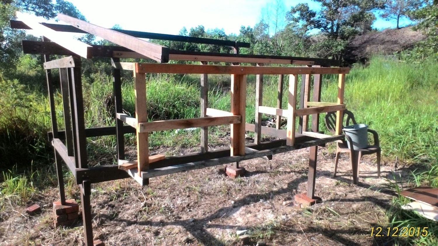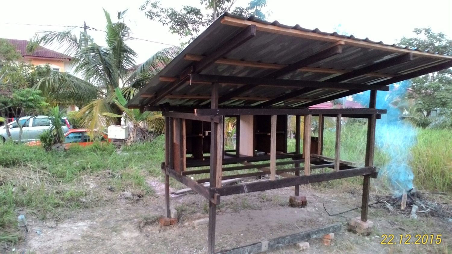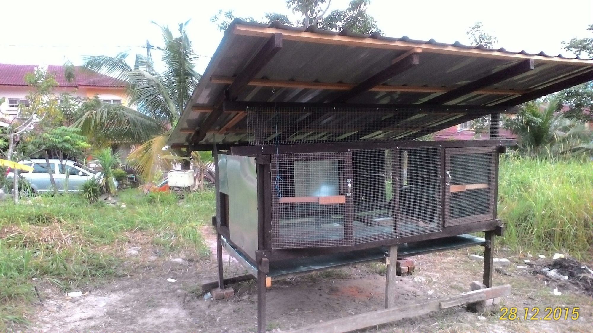 Started on Nov,2015. I'm using left over woods after house renovation. As its been there too long under the sun, some of the woods I'm using are mostly having slightly bent. I've got no choice & extra $$$, so I have to fully utilize whatever is there. After cutting it to the measurement & doing the wood joinery part, I paint it with wood stain. With the help of my son, we set up the main coop at the front field area and started to assemble the frame on uneven ground. Using some bricks to level it up.