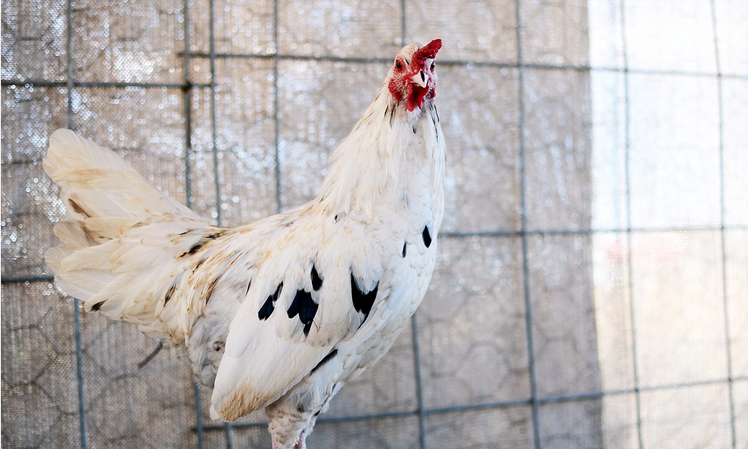 This is "Some Guy" - a mega mutt. Blue Partidge Silkie x Araucana(Leghorn x Polish)