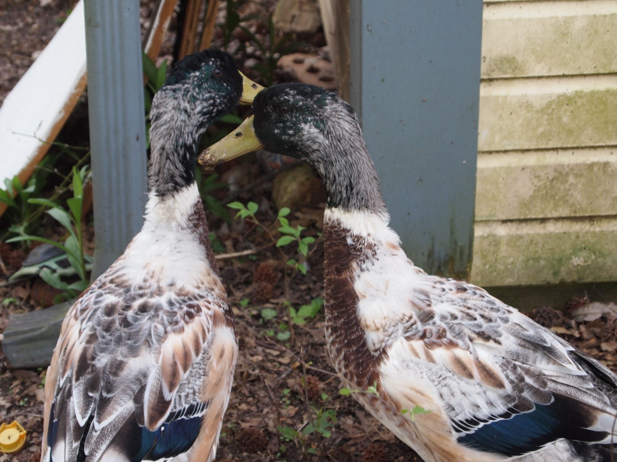 Are there ducks in that picture? I can't see anything! These two boys are Welsh Harlequins and they LOVE diving for green peas. They are only six weeks old and bigger than my Black Stars!
