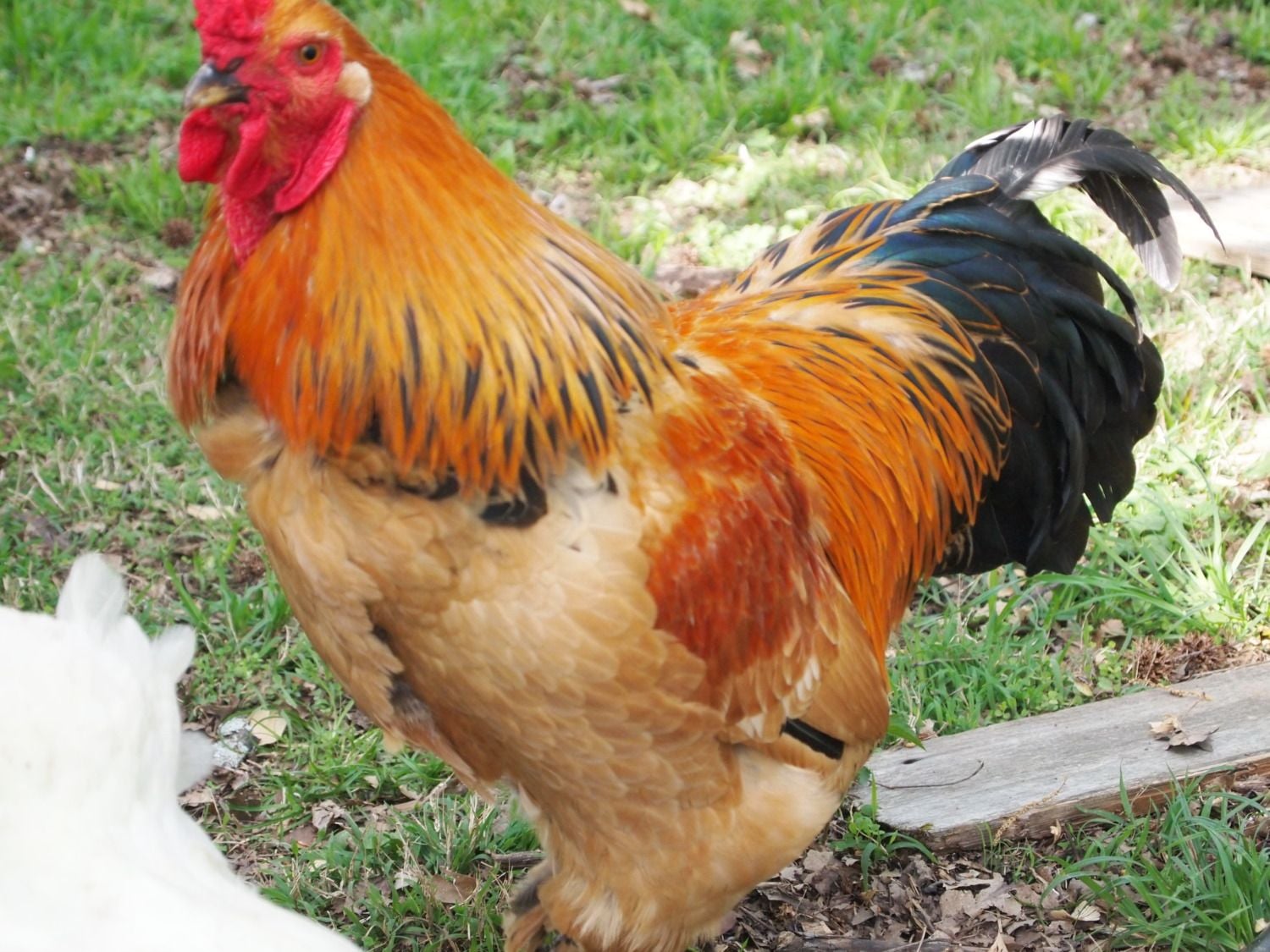 He is a Buff Brahma rooster and about 5 months old. He has thankfully not yet started crowing, since my no-crow rooster collar hasn't arrived yet.... hoping this will prevent anyone from noticing my illegal pet.