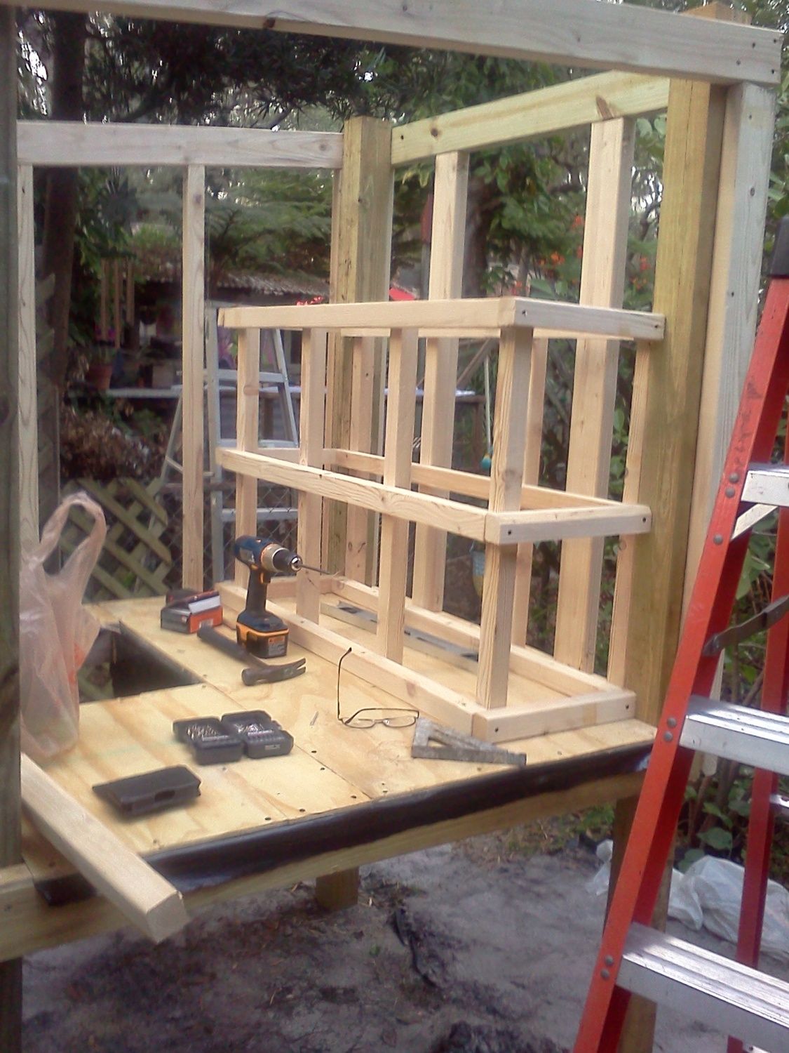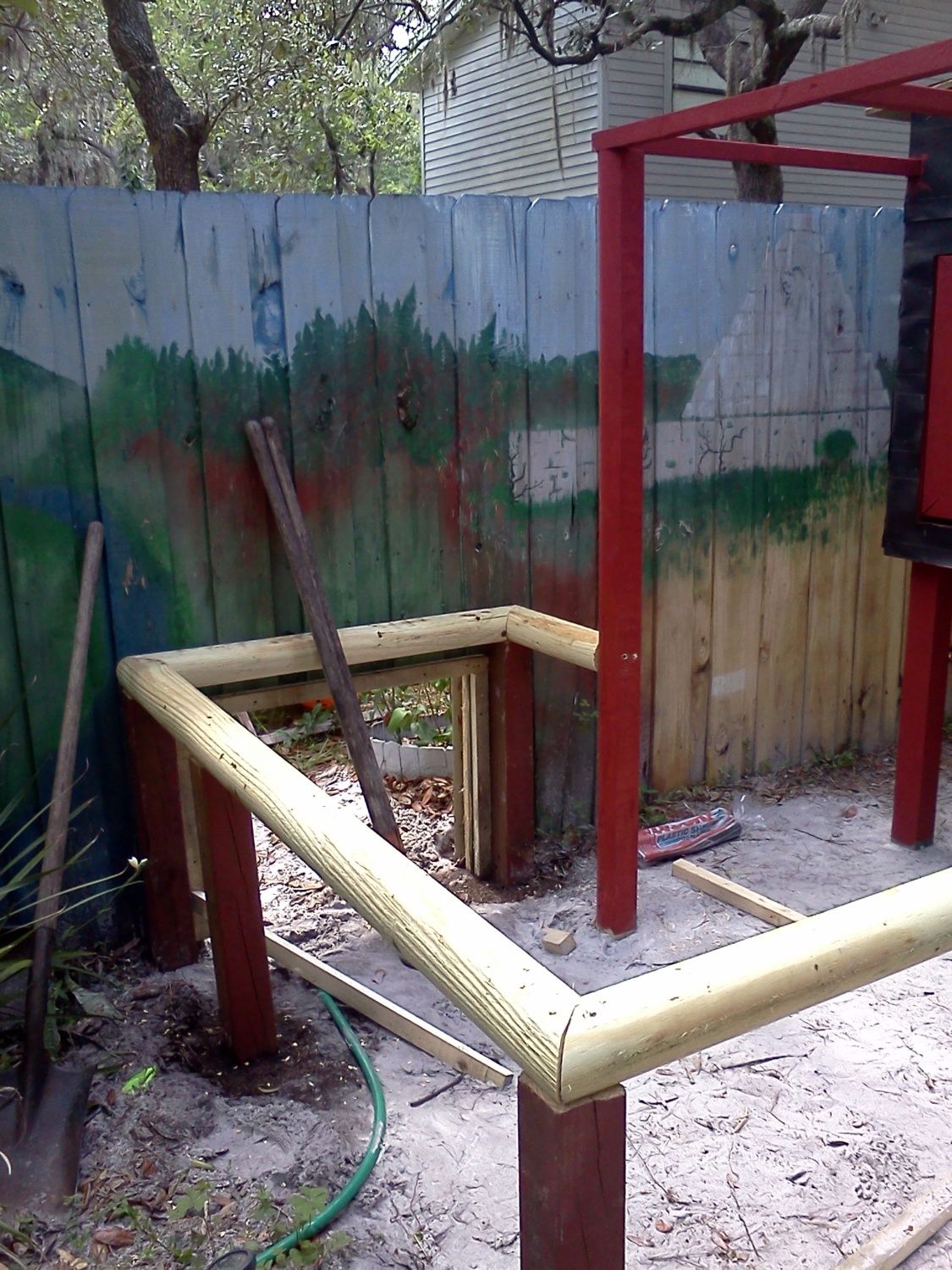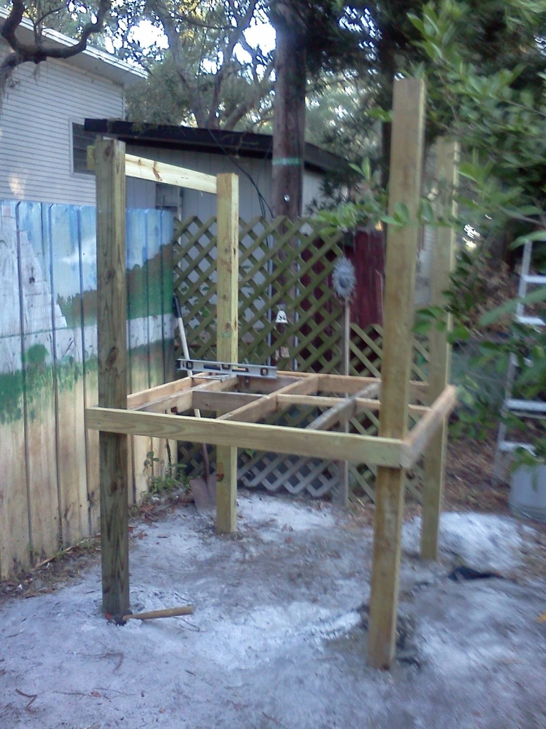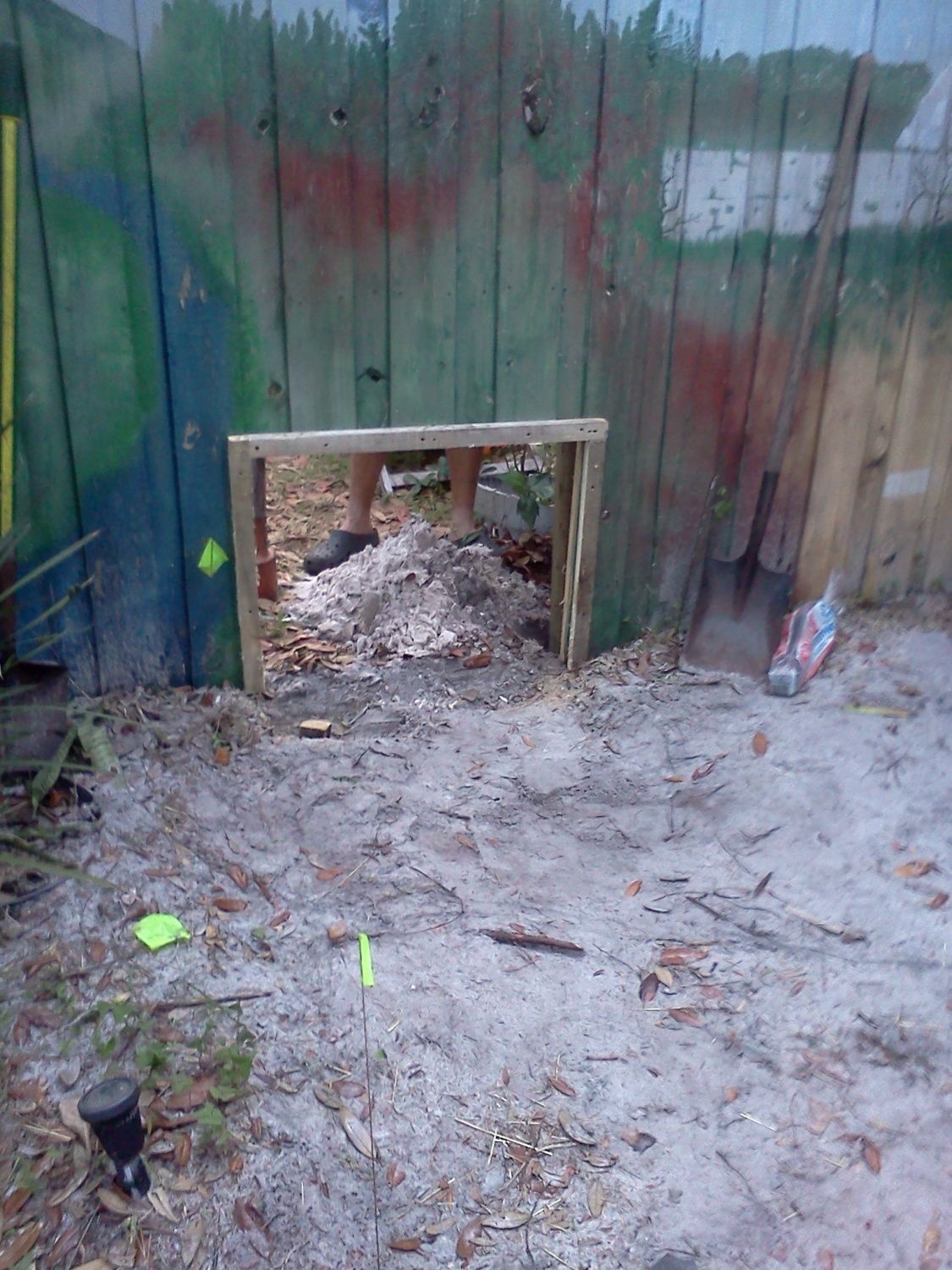 Once the pen was framed, we began to lay the floor. Yes,..the Floor. Florida is a wildlife filled environment and racoons, possums, and other small predators are all present in our state and my urban neighborhood. We have lost many Koi to foragers and wanted to avoid any carnage with our new pets. To keep our new flock safe, we wanted the pen proofed against local night time visitors.