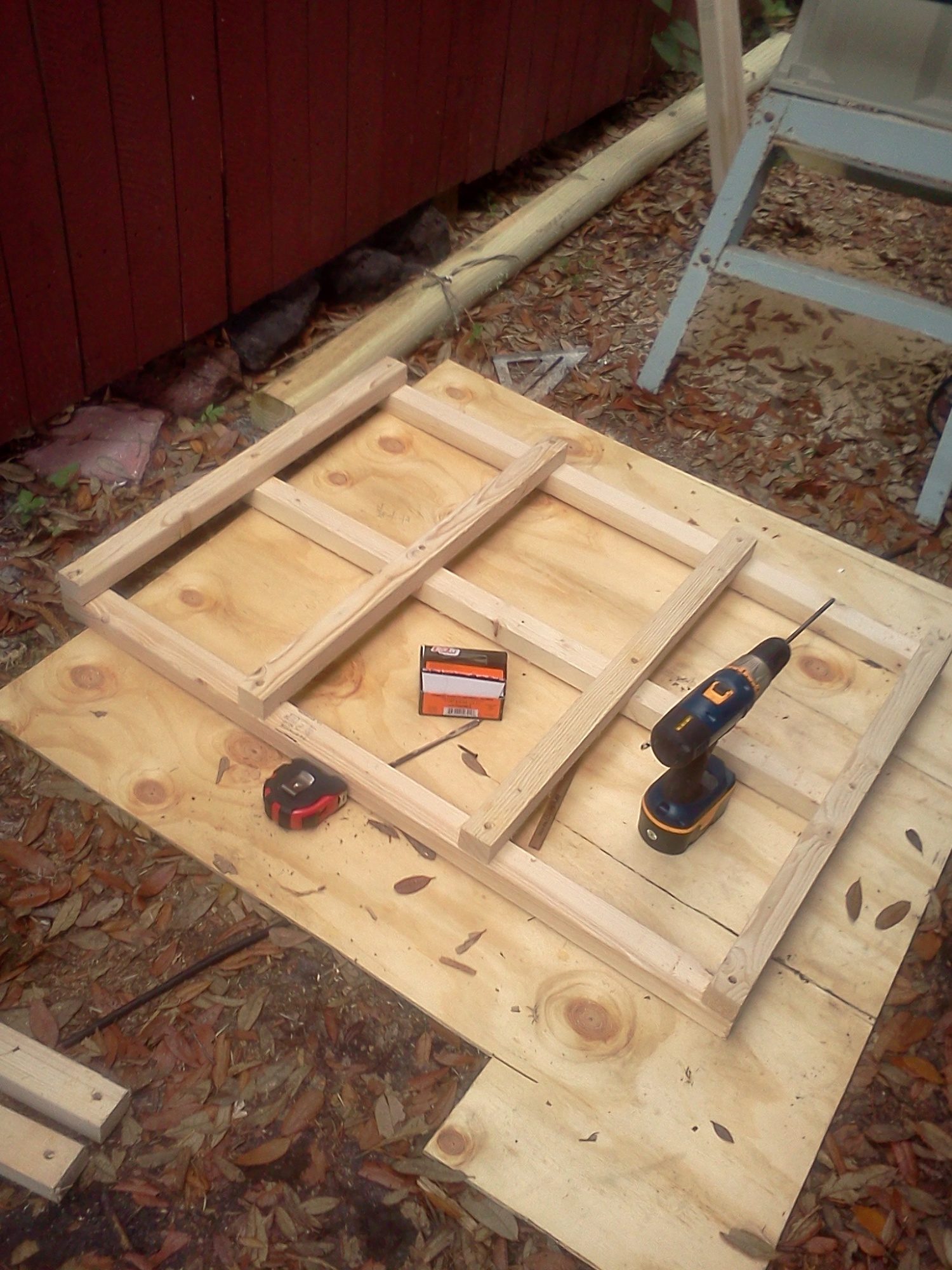 Tied at the outside with recycled 2x4s, it creates a 48x48 outside square. We made one side 6 inches higher than the other (48" from floor vs 42") to create a roof slope and a rafter cooling space as we live in humid, hot Florida. We used 1/2" plywood from my wood scraps pile to cover the floor patchwork like, leaving an adequate sized elongated hole for the ramp. We covered the floor and nest box bottoms in tar paper to create a vapor barrier and make clean up a little easier and then more pallet slats for sides and bottoms.