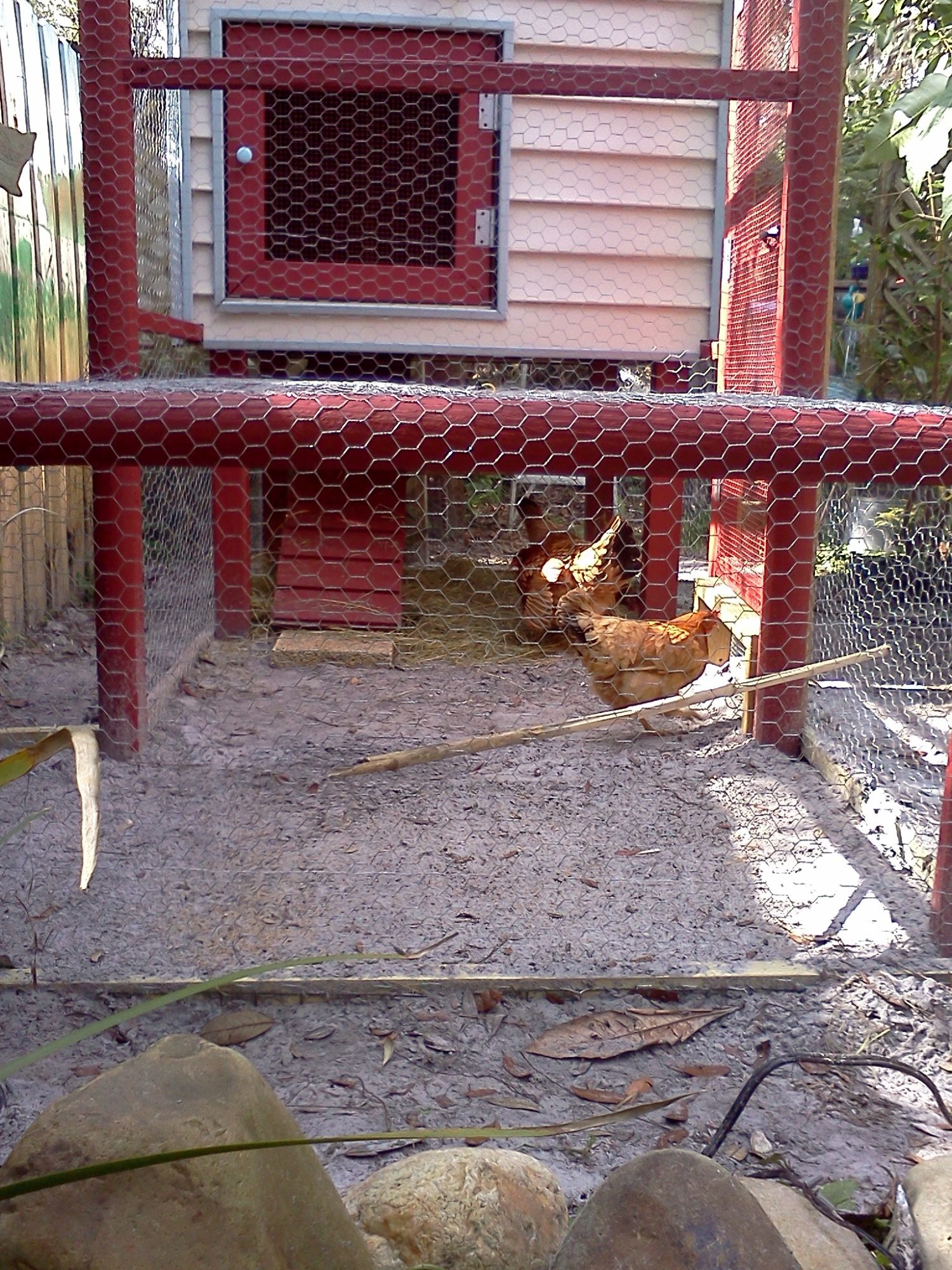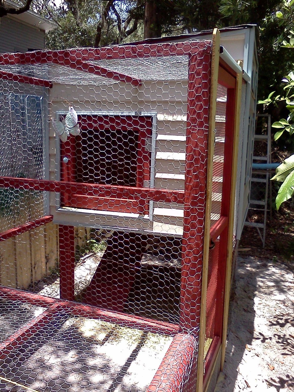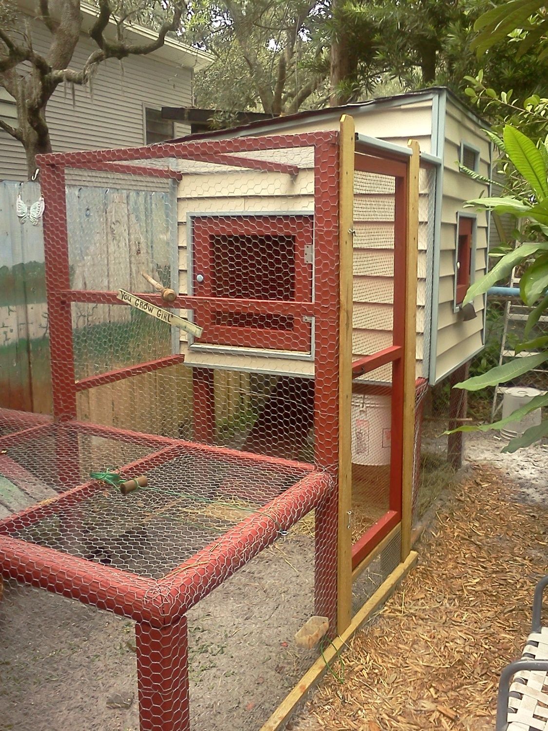 We added a small hutch in the run for day nesting and shelter. Its just a nice cool place for the birds to hang out when the weathers wet or hot (thats every day here in sunny FLA). With a locking ramp door and shingle roof, its also a safe spot for new birds to hide out in when the pecking order gets hot and heavy. Since we are adding three new birds, we wanted to take the "Introduction to the flock" issues in hand now so the new birds can have a place to hide in when the Alphas in a bad mood.
