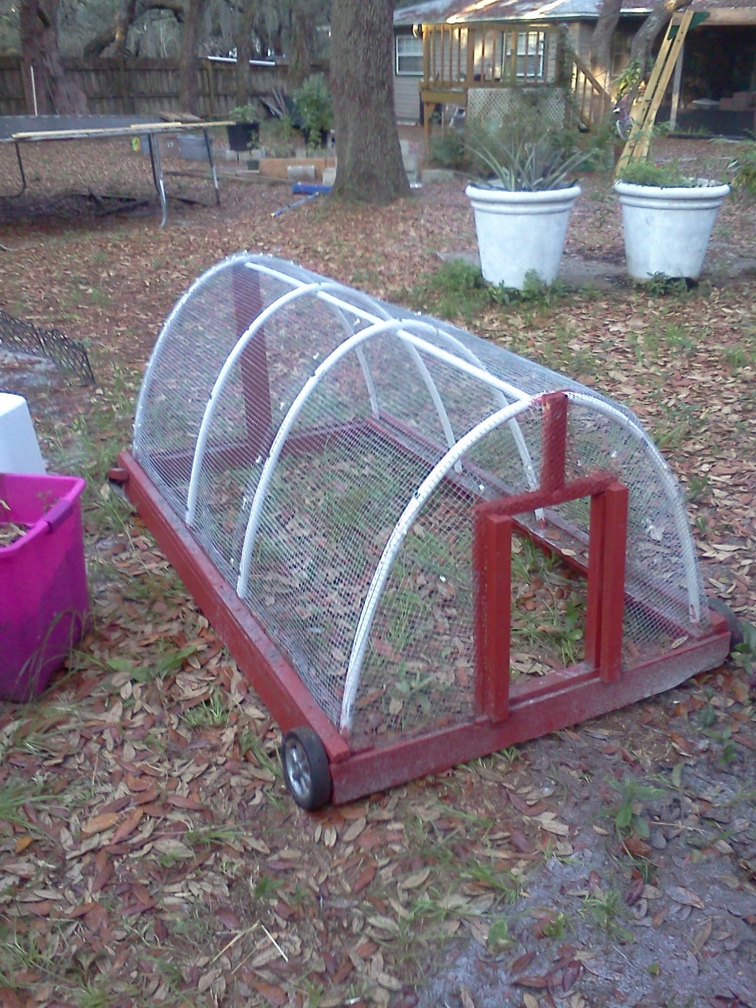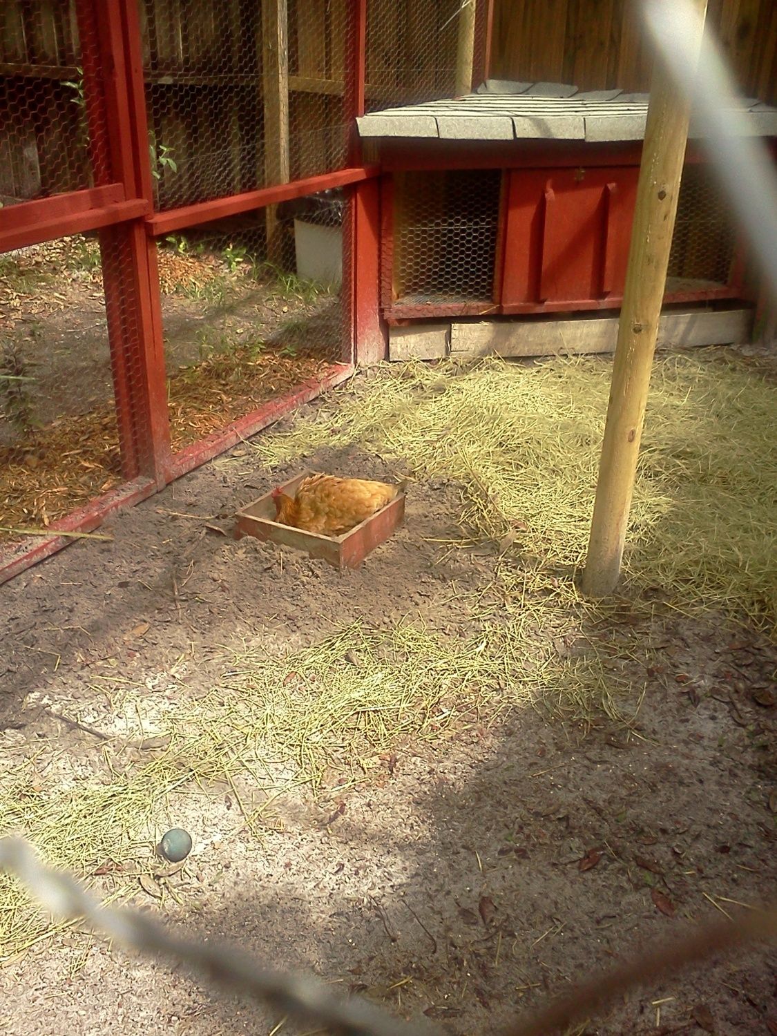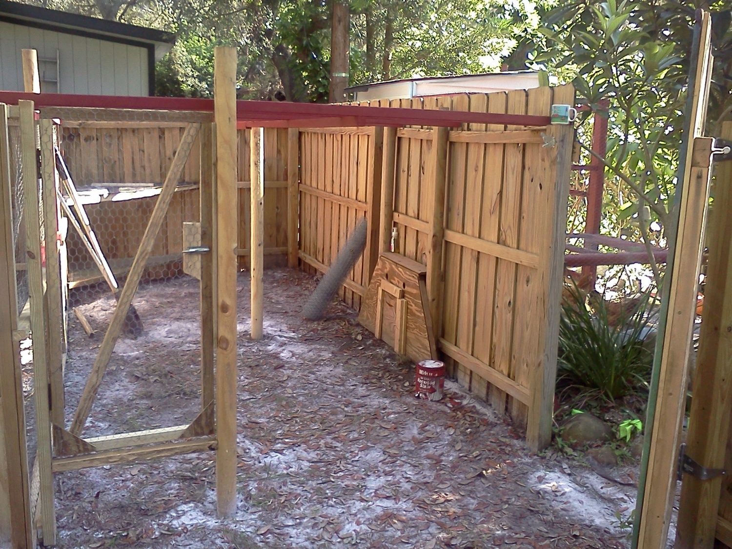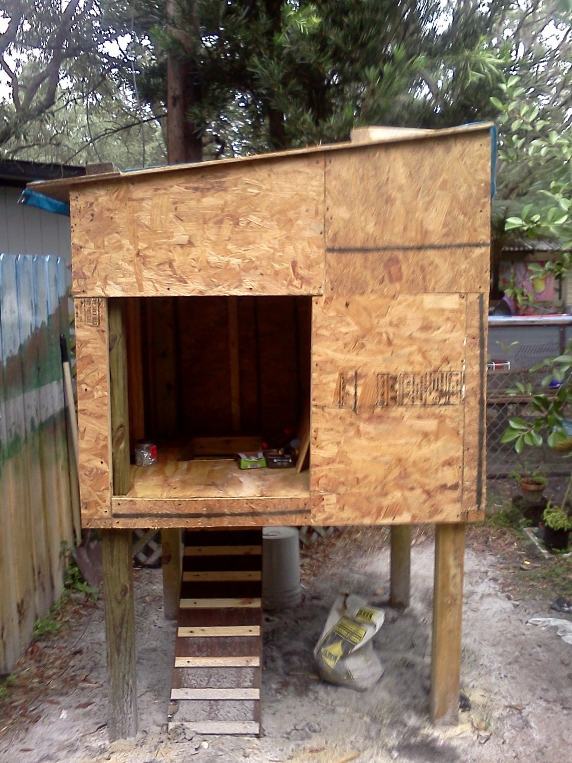 We added a small hutch in the run for day nesting and shelter. Its just a nice cool place for the birds to hang out when the weathers wet or hot (thats every day here in sunny FLA). With a locking ramp door and shingle roof, its also a safe spot for new birds to hide out in when the pecking order gets hot and heavy. Since we are adding three new birds, we wanted to take the "Introduction to the flock" issues in hand now so the new birds can have a place to hide in when the Alphas in a bad mood.