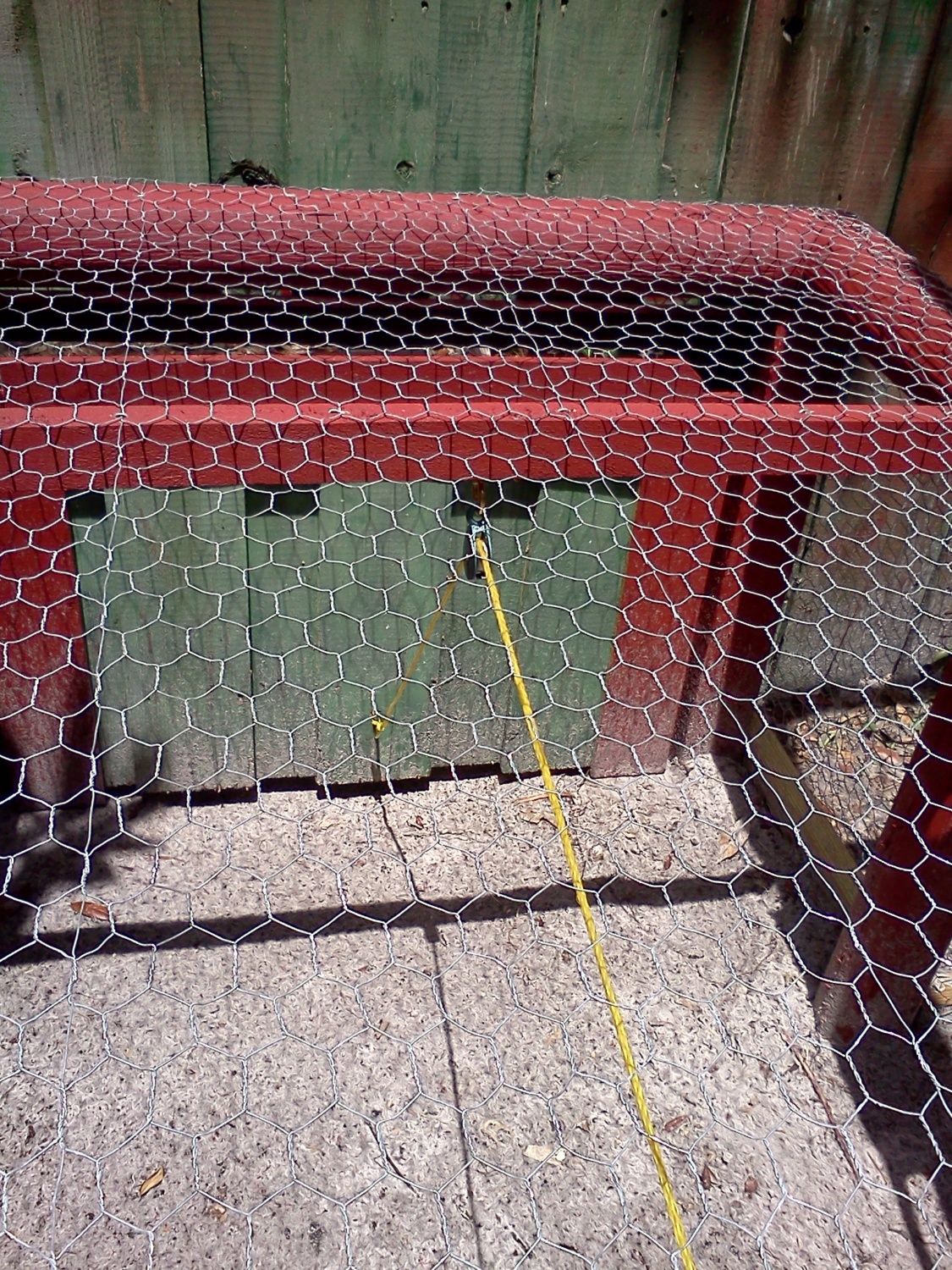 We used dog pen wire (2" x 4") to create our critter barrier on the bottom of the pen area. First, we dug down and removed about 6 inches of soil from the pen area. Then we carefully cut and laid the dog wire in the pen, cutting around the posts and edges and leaving about 4 inches Outside the pen boundry. Once in place, we replaced the soil in the pen over the wire and now had a wire grid UNDER the pen covered in 6 inches of soil. Now we finished framing in the pen walls and roof so we could get to the wire.We took care to make our frames no more than 34" apart to take advantage of the cheaper 36" wire rolls.