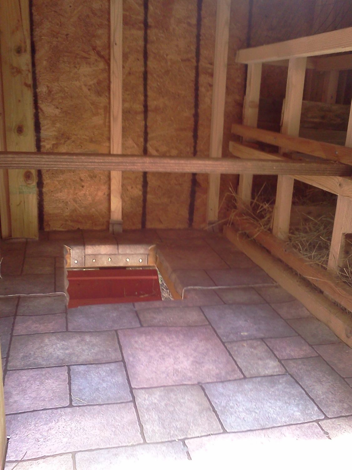 With the exterior pretty much done, we turned to finishing the inside. A Wire screen was added above the nests to keep the birds from climbing on the top nests occupants. We added a roost pole to give the birds a easy perch indoors. Edges were sealed to provide a scrubable surface. The bottom of the front clean out door is even with the floor so debris, hay and poop can be swept out the door. The doors and vent provide ample light and ventilation and the birds took to the new coop immediatly.