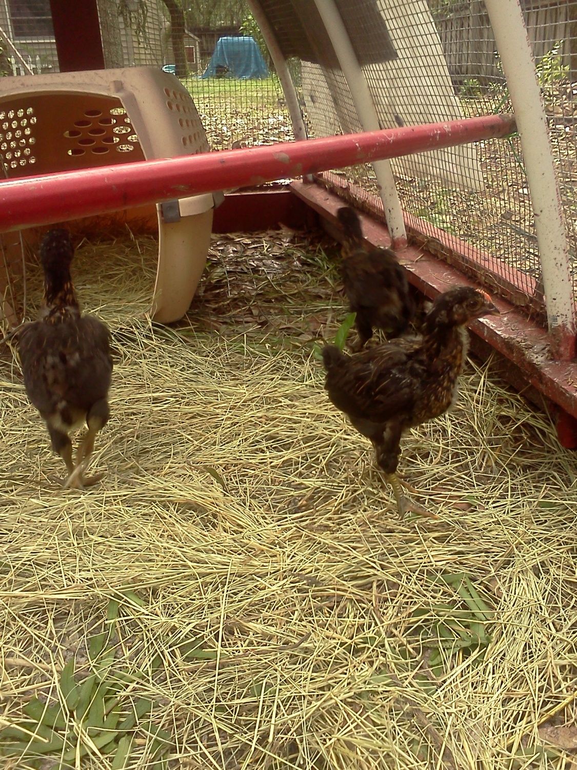 They are living in the chicken tractor we built from scrap pallets, old pvc and a busted luggage cart. The chicks will need to stay in quarantine for another few weeks before meeting the flock through the wire. Once they get near the adults size, we will let them mix physically. Meanwhile, the three stooges are a gas to watch and will be a fun addition to the flock. They are just getting a second set of feathers and rocket around the tractor pen like meteors trying to take flight. Soon they will have tons of space to run in.