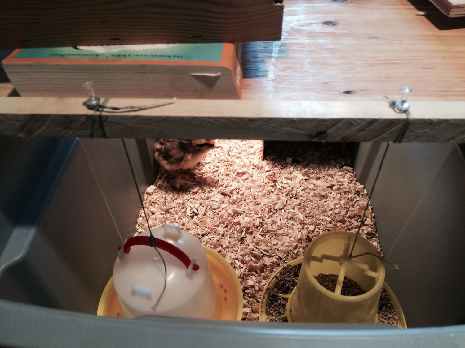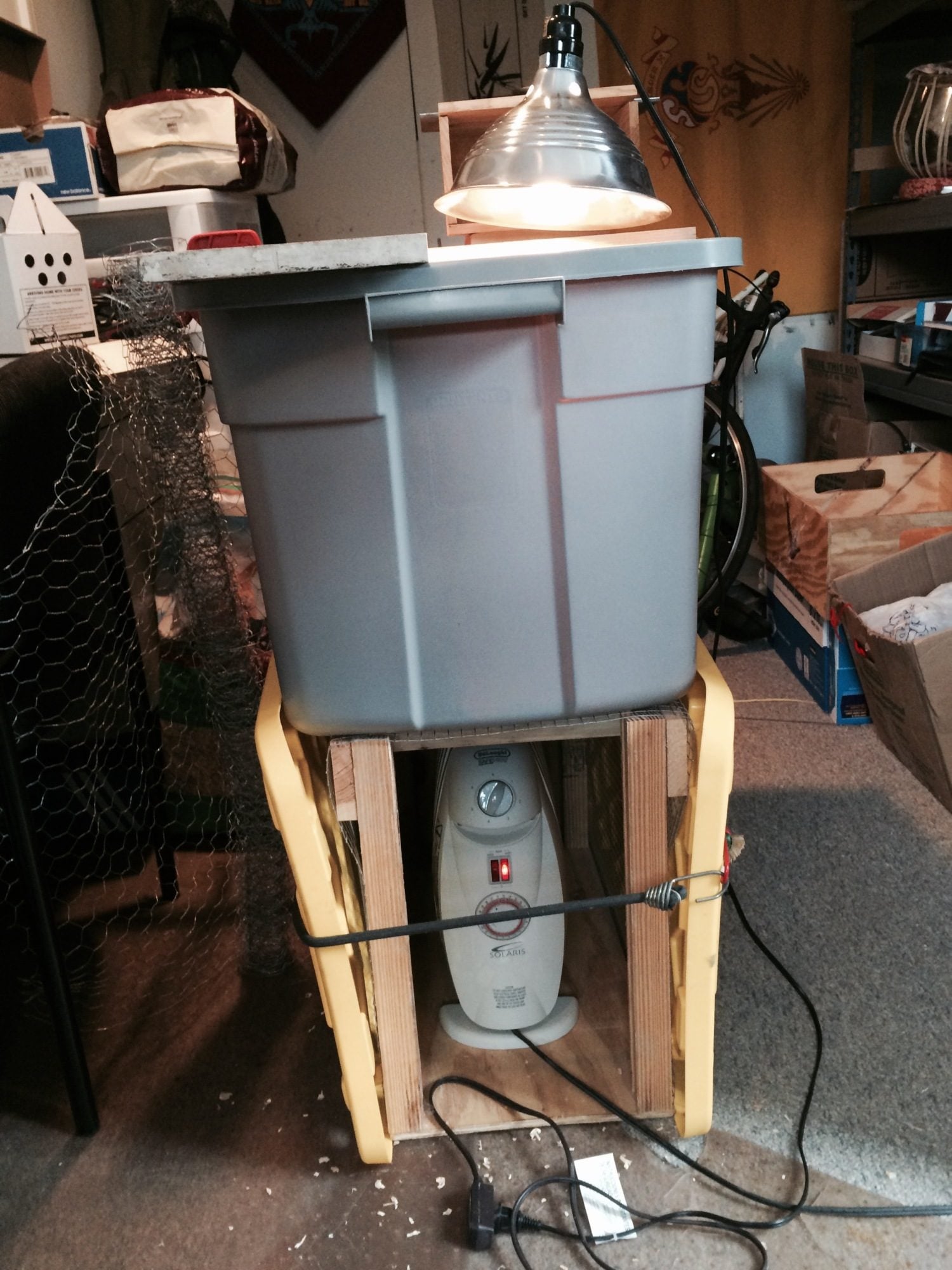 My solution was to place a space heater below the brooder box, which is just a big 30 gallon plastic bin. I already had built a wood and hardware cloth "cage" for the space heater to safely sit inside, as I used it to heat my three little kids' room and my wife was (rightly) concerned about clothes, blankets, or paper being set on fire.