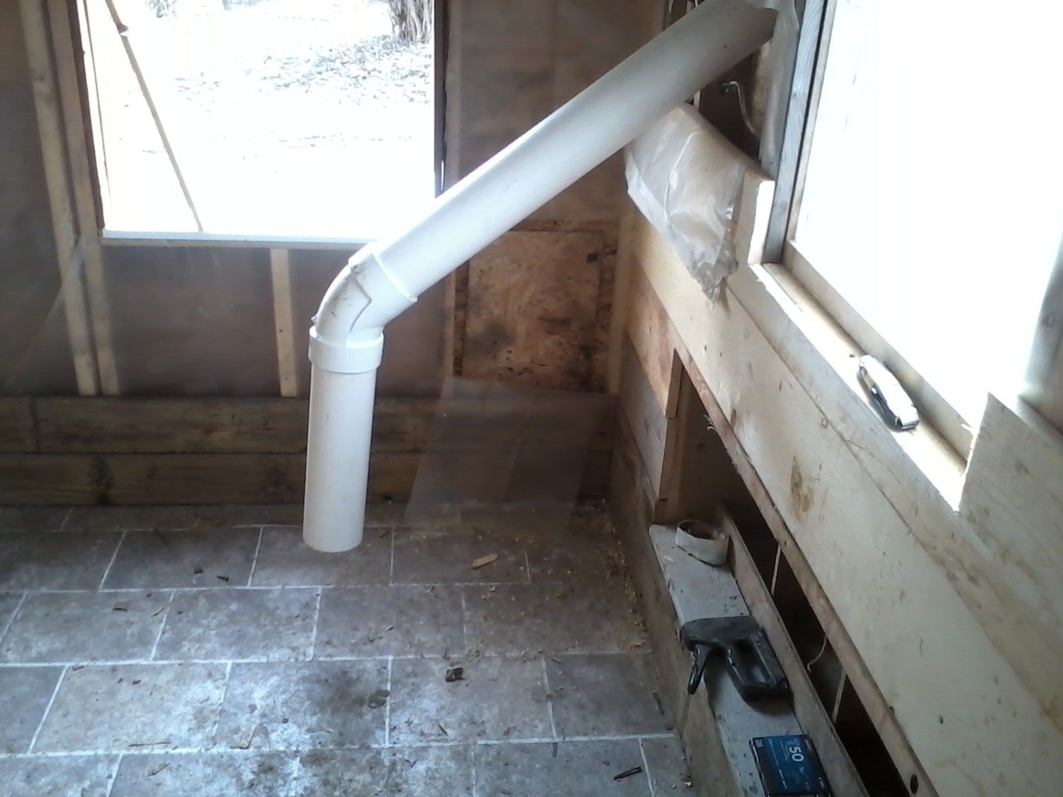 In order to get the right size and shape of the hole Cut take a piece of the pipe and cut it at a 45 degree angle (A miter saw is good for that) Then you can cut a hole in the wall to get the pipe through. ( I didn't take any pictures of that) One thing you may have to do is take off a little more off the bottom of the wall to account for the thickness of the wall.