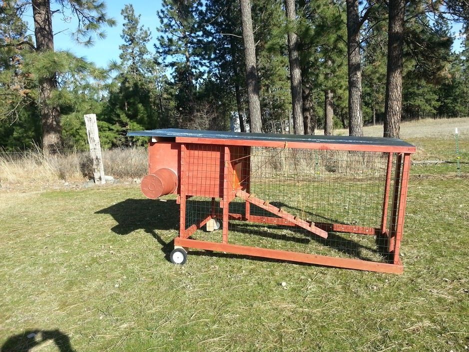 The run is 8 feet by 4 feet. The indoor roosting area is about 42"x42" with two external nest boxes (buckets). It cost between 200-300 dollars to make and I spent a couple weekends (only a few hours per weekend) building it. Note that the wheels rotate under lifting the coop. When they are rotated out, the coop sits flat.