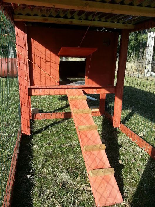 The floor of the roosting area was covered with hardware cloth and a door was cut. THe whole coop was covered with corrugated metal roofing in 10 foot strips.
