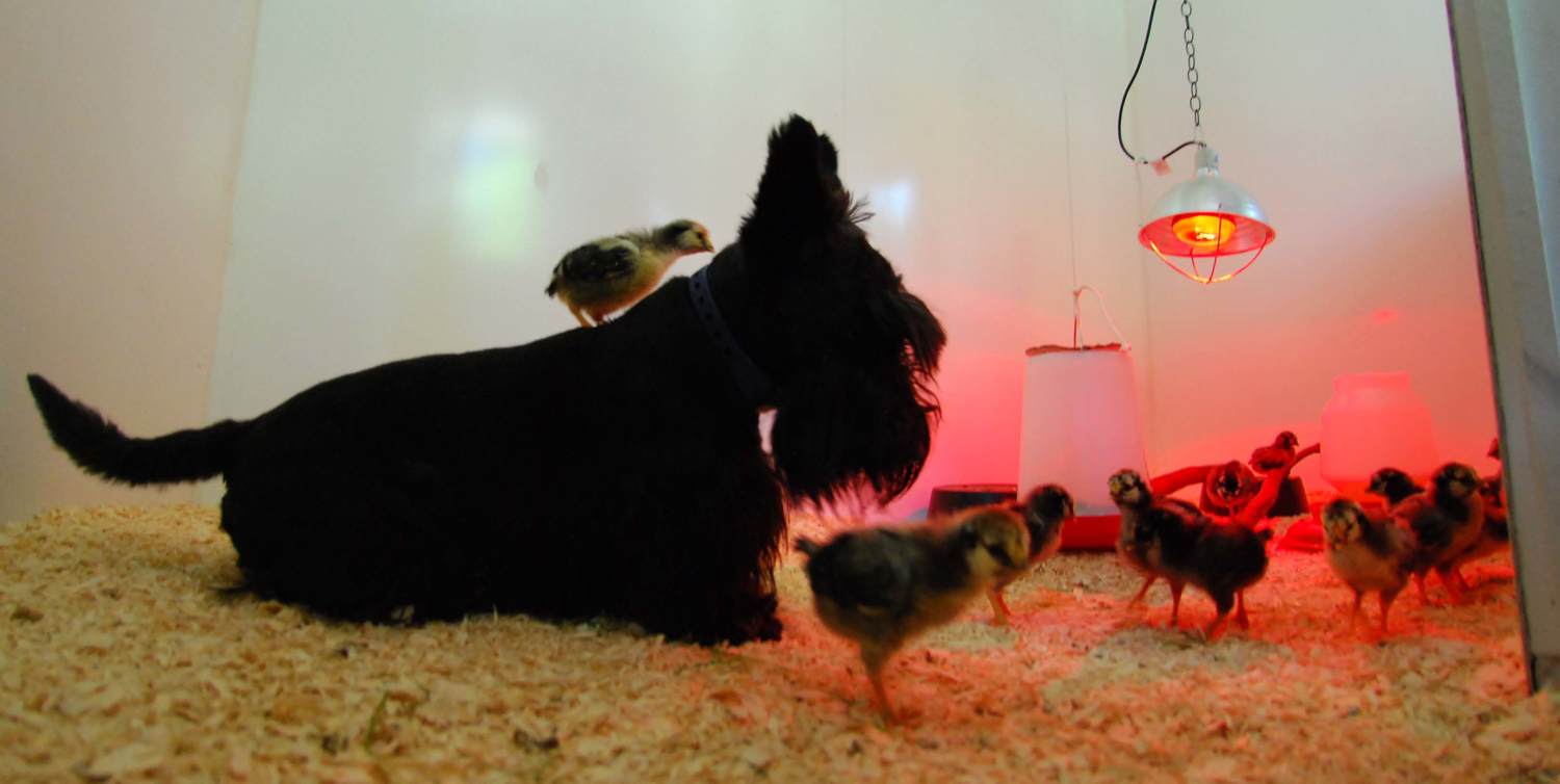 After 8 weekends of construction, 16 Silver Lace Wyndotte peeps arrived via USPS and moved into the brooder. Immediately Barclay, our Scottish Terrier, wanted to see what all the commotion was about. He and the chicks have become close, they ride on his back, and he watches over them like a mother hen,... think with time and training he'll be a excellent "flock' herder.