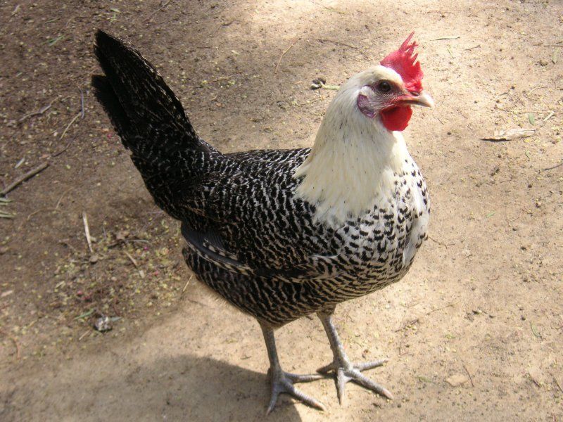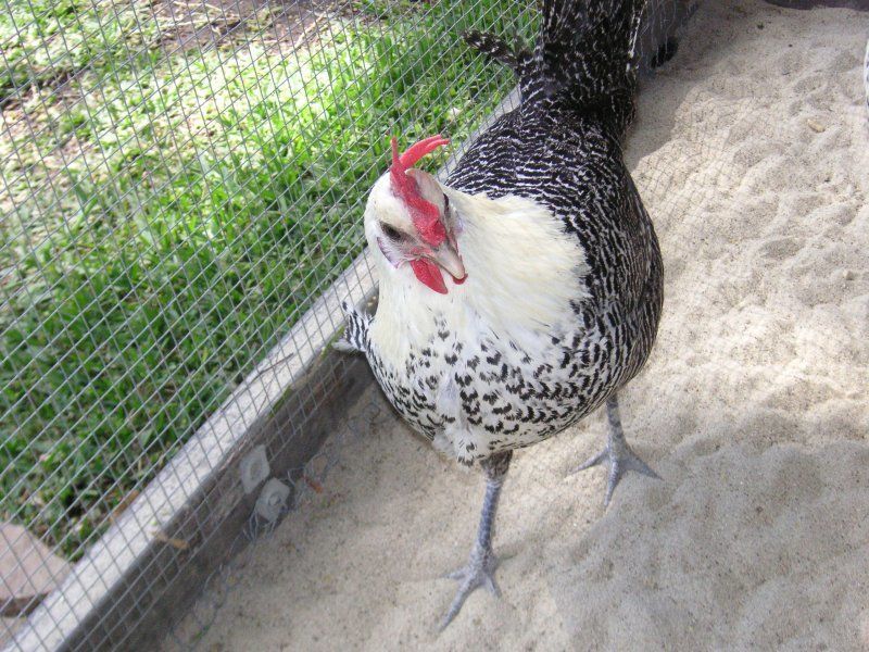 Campine Silver Created by Renee Breed Information, Comments, and Experience with breed: The Silver Campine originated in the Campine area of Belgium. It is a small, hard-feathered breed with a large single comb and white earlobes. Hens weigh about 4 pounds, cockerels about 6. They lay a large white egg. The cocks are "hen-feathered": they do not develop distinctive feathering. Silver Campines are barred black and white with white hackles. They have beautiful big dark eyes. They will tolerate some cold, but have large combs. My Silver Campine hen is active, curious, fast, and can fly well. She loves to forage, but she's okay in the run too. She's loud: she never stops talking if she thinks you are listening. She hates being picked up but loves to jump on my lap and get pets. When I scratch her comb or ears she closes her eyes and falls over on her side in my lap like she is dead, talking the whole time. When she has had enough, she unceremoniously stands up and jumps down. |