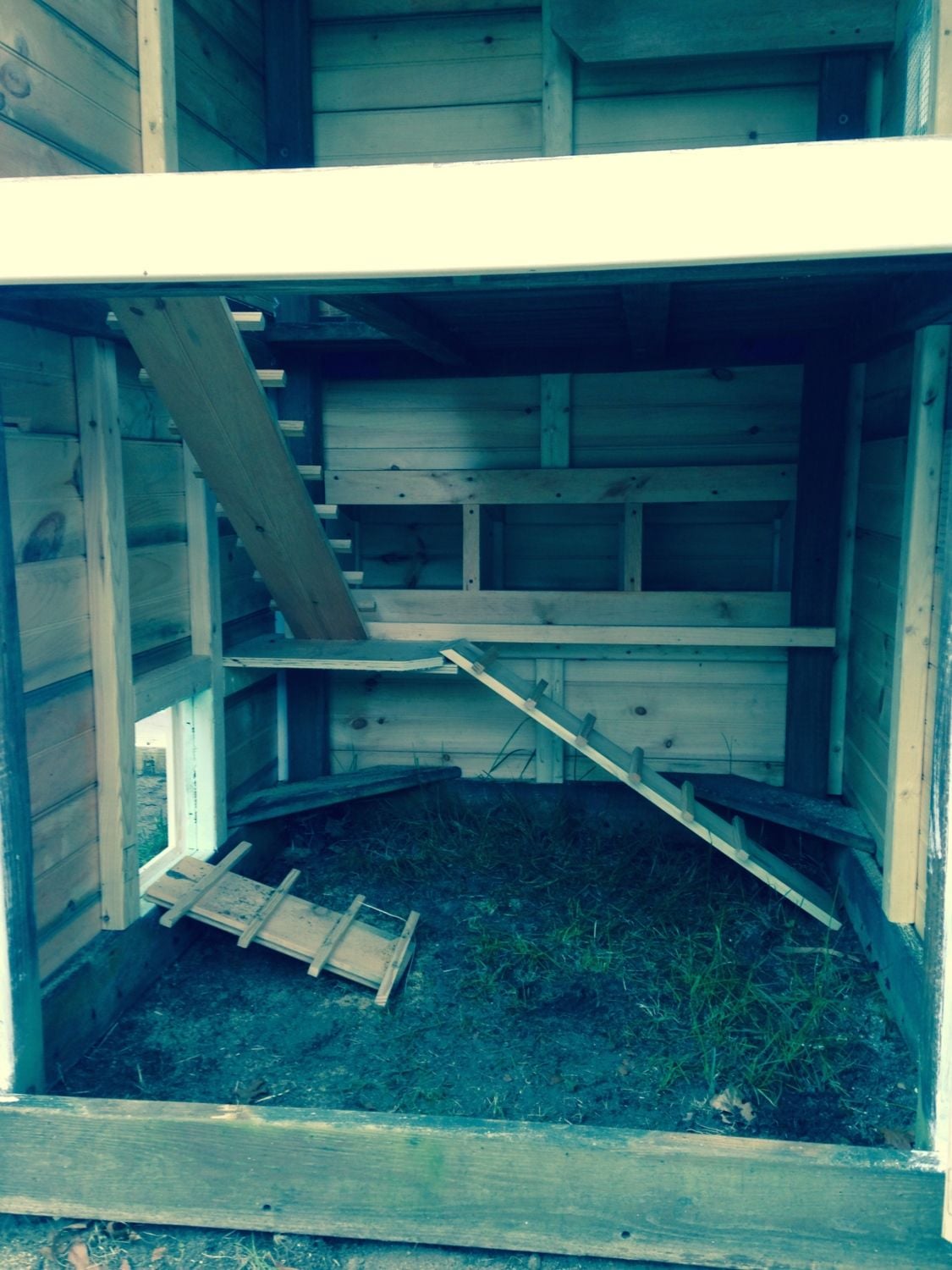 This is a picture of the bottom floor before the feeder and waterer were installed you can see the two ramps that they use to get from the bottom floor to the top floor. There is a platform at the top of the first ramp so they can walk over to the nesting boxes.