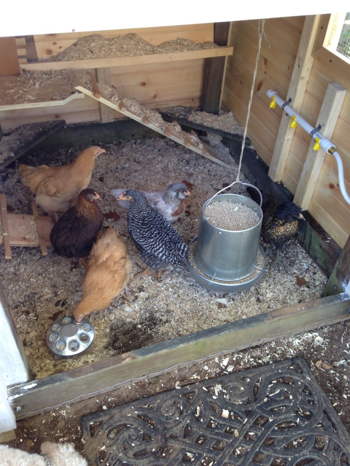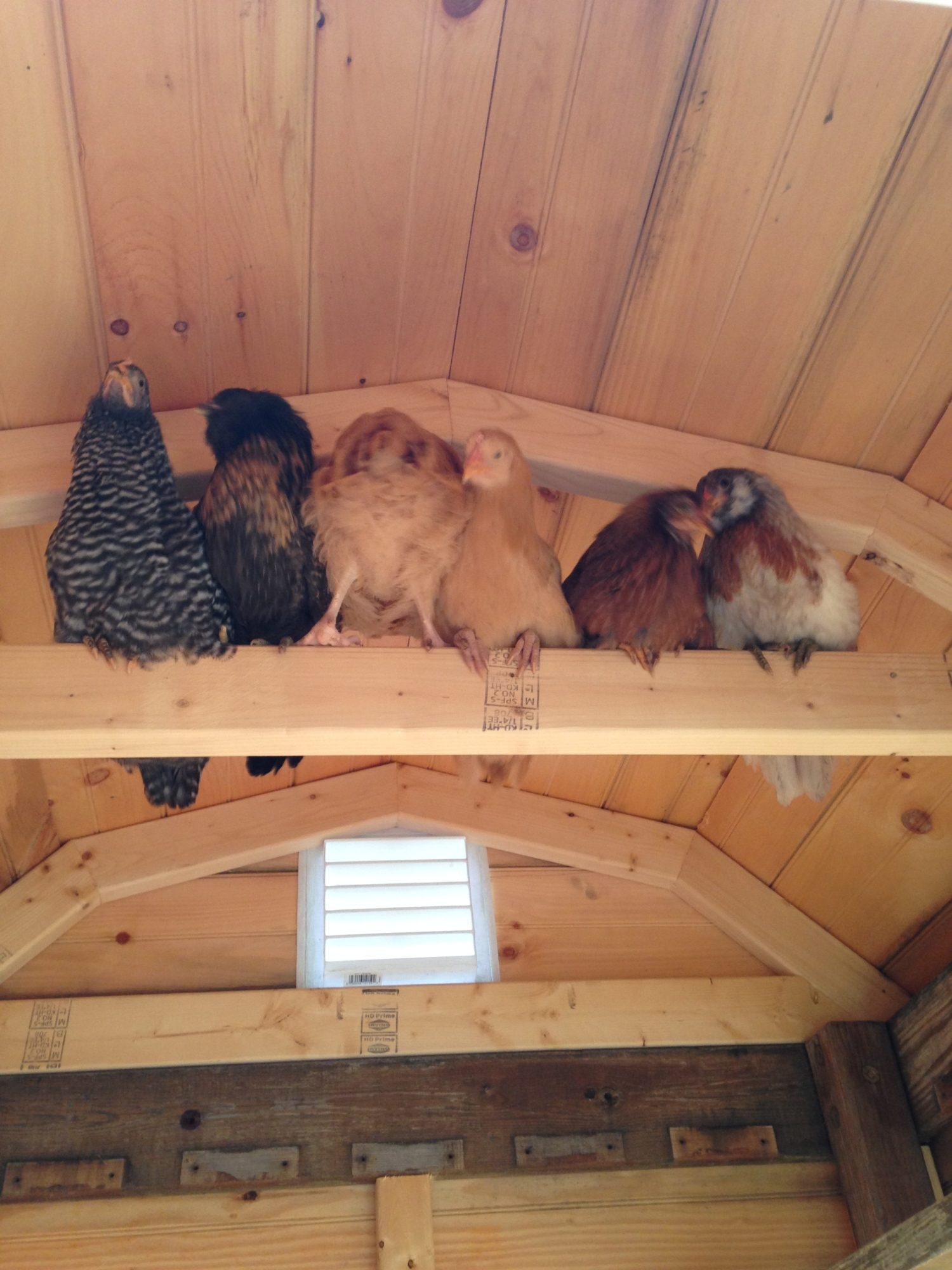 These are the chickens the morning after their first night in the coop. They roosted on the rafter, which we ended up taken down after a couple weeks.