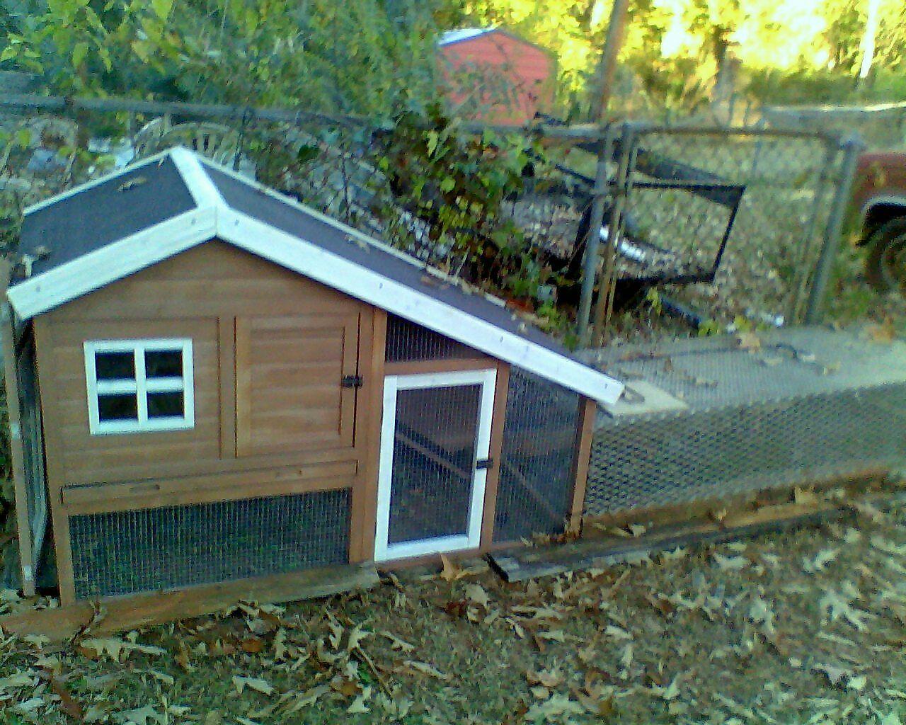 We added a light bulb to the inside of the house part of the coop. I'm going to put a small 75 infrared light in there that cuts on at dusk and a fan on the top for ventilation. The window is plexy glass so I can take that out in the warm months and add it back when it's cold. They will be free run so not as large as I would have preferred but will be fine because they will be outside of it 75 percent of the day. Not as pretty as you girls might think but it looks nice and I'm proud of it. Now can't wait to get these chicks outside. Just 2 more weeks if the weather is just right. I'm going to start taking them out for a few hours every day on warm days and close off the coop just so they can get use to it and use the light for warmth. Night Night and Trick or Treat. Ill post a picture tomorrow. This will be partial home for four Red Comets, one Rhode Island Red and one mystery breed. We are not sure on the Rhode I Red. I think it's a mix of a RI Red. We are getting four mystery brown egg layers on the 5th or 6th. We are giving two away. All we know is that they have a list of about 7 brown egg layers and they will be a mix of those and all hens. We don't have a rooster. It will be fun trying to figure out what they are. We have a ugly but very reliable, weather proof and predator proof coop hidden in the yard since we will have more birds than this will accommodate. It's much larger but ugly. That's why it's hidden behind the Garage and some Cedar trees. You can't see it if looking out the window to the back yard. I have two pullets in in it now. It's HUGE but not kind to the eyes. We are going to introduce the two week old chicks to the new one for a month or so and as they get older they can choose which one to roost in.