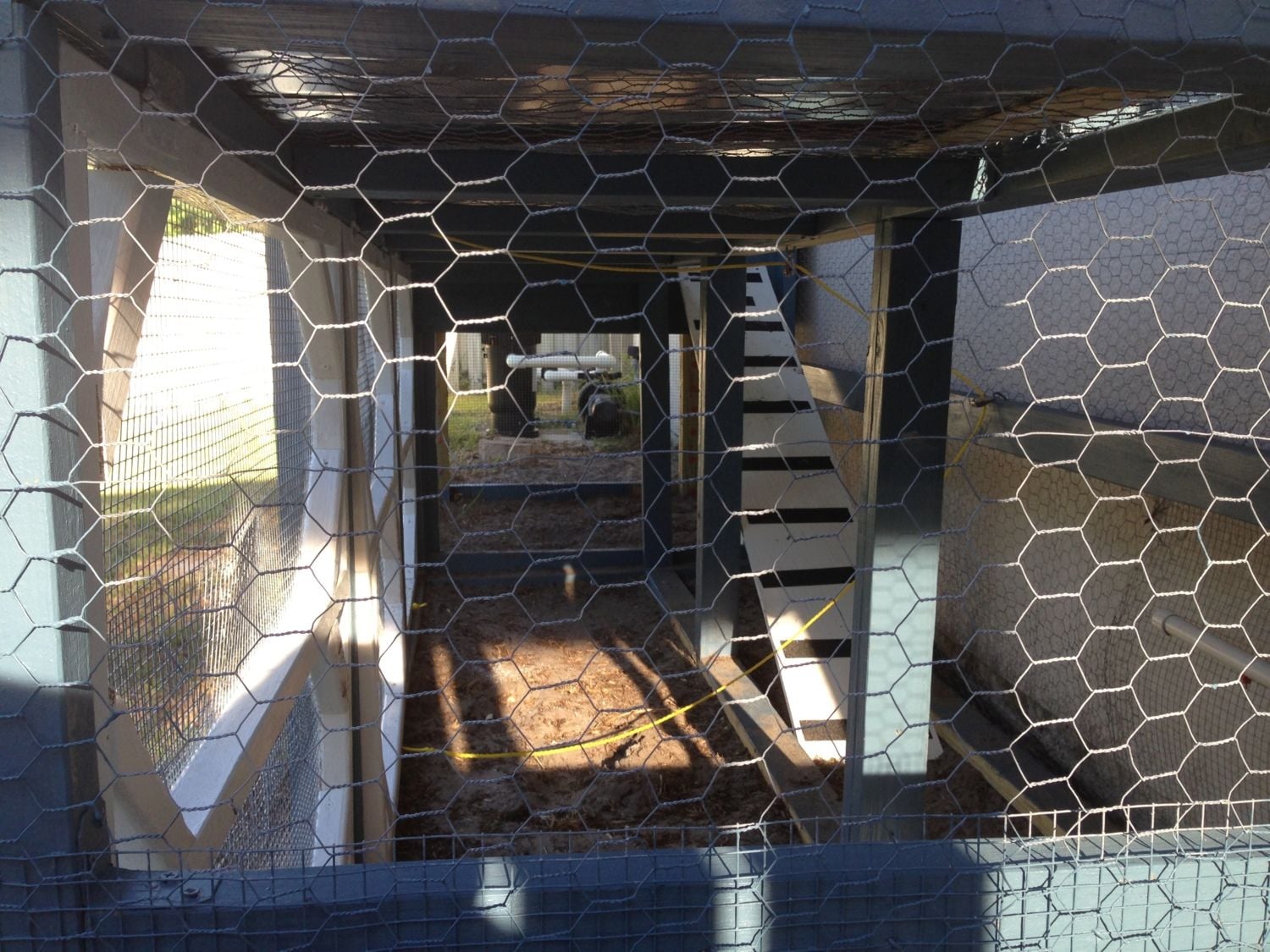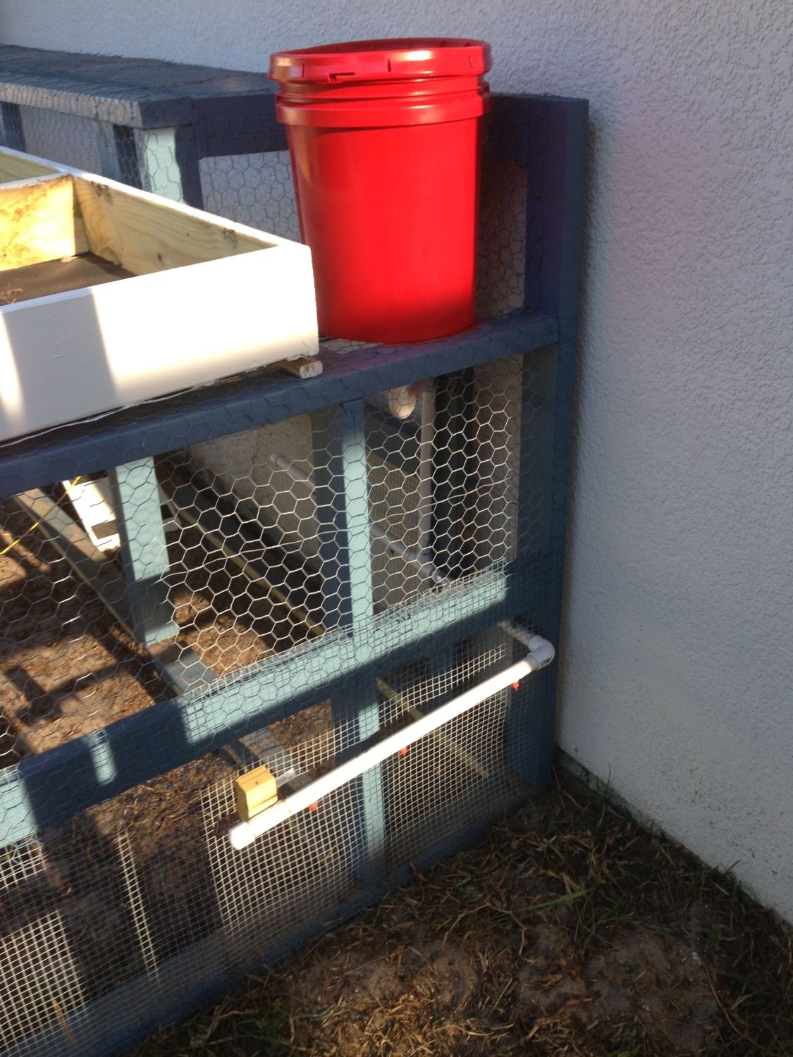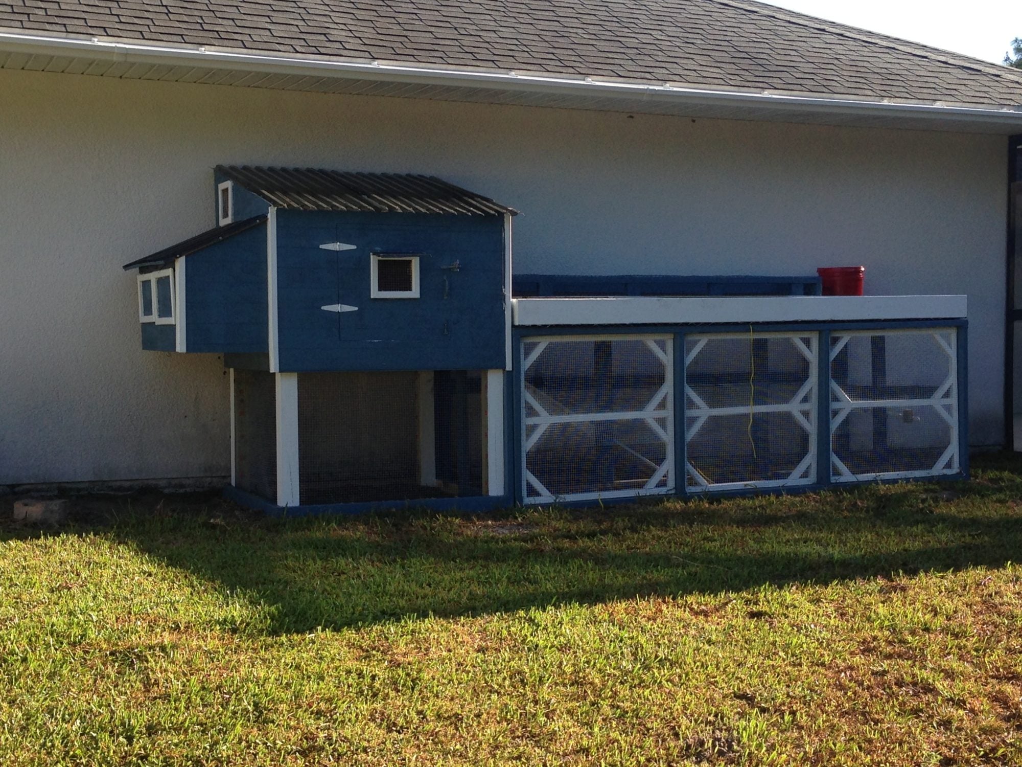 welcome to our coop. We are beginners and never had any kind of livestock before. I started by looking at several different designs on BYC and a took a little bit from many different designs. Our coop/run has 2 watering systems, 1 for inside the coop and 1 for the run and outside the run for when our girls are free ranging. Our girls are only 5 weeks old now and we are training them to use the pins while in the brooder and they are getting the idea of it slowly. The coop is 4x4 and the nesting boxes are 2x2. each. I used 4 inch PVC elbows to make a feeder and cut the top off of one of the elbows to make the feeder opening. there are 2 roosting bars made from 2 inch PVC pipe with grit/no slip tape on top. I made a coop door that is weighed down with lead fishing weights(about 5 pounds worth) with a rope that goes out to the front of the coop with a small boat cleat to tie it down in the up position. The weight from the lead will let the door fall when released. The run has a 4 and a half foot ramp from the coop door. The run is 4x10 plus the 4x4 area under the coop and has a 10x3 herb garden on top which also gives the run tons of shade (which they will need here in central Florida). The 3 doors in the front of the run open up for cleaning and to let the girls out to free range. I will be adding roosting bars to the run soon. The coop and run have cinder blocks buried in the ground under the perimeter to prevent digging predators from getting in. I hope you enjoy viewing our coop!!! I certainly enjoyed building it and I think our girls will love their new home once they are old enough to live in it full-time. All comments and suggestions are welcome. I will be happy to answer any questions you have as well.
