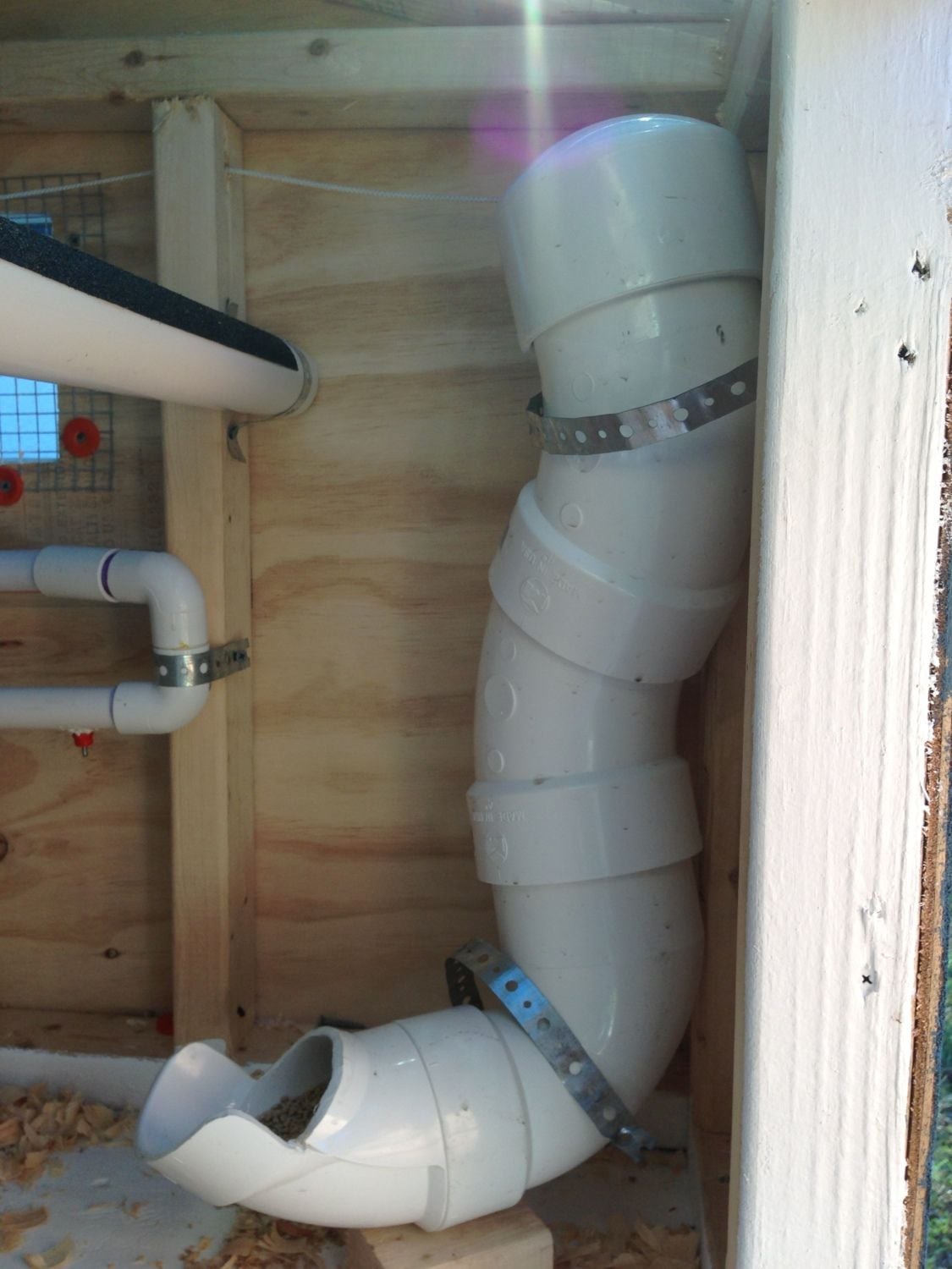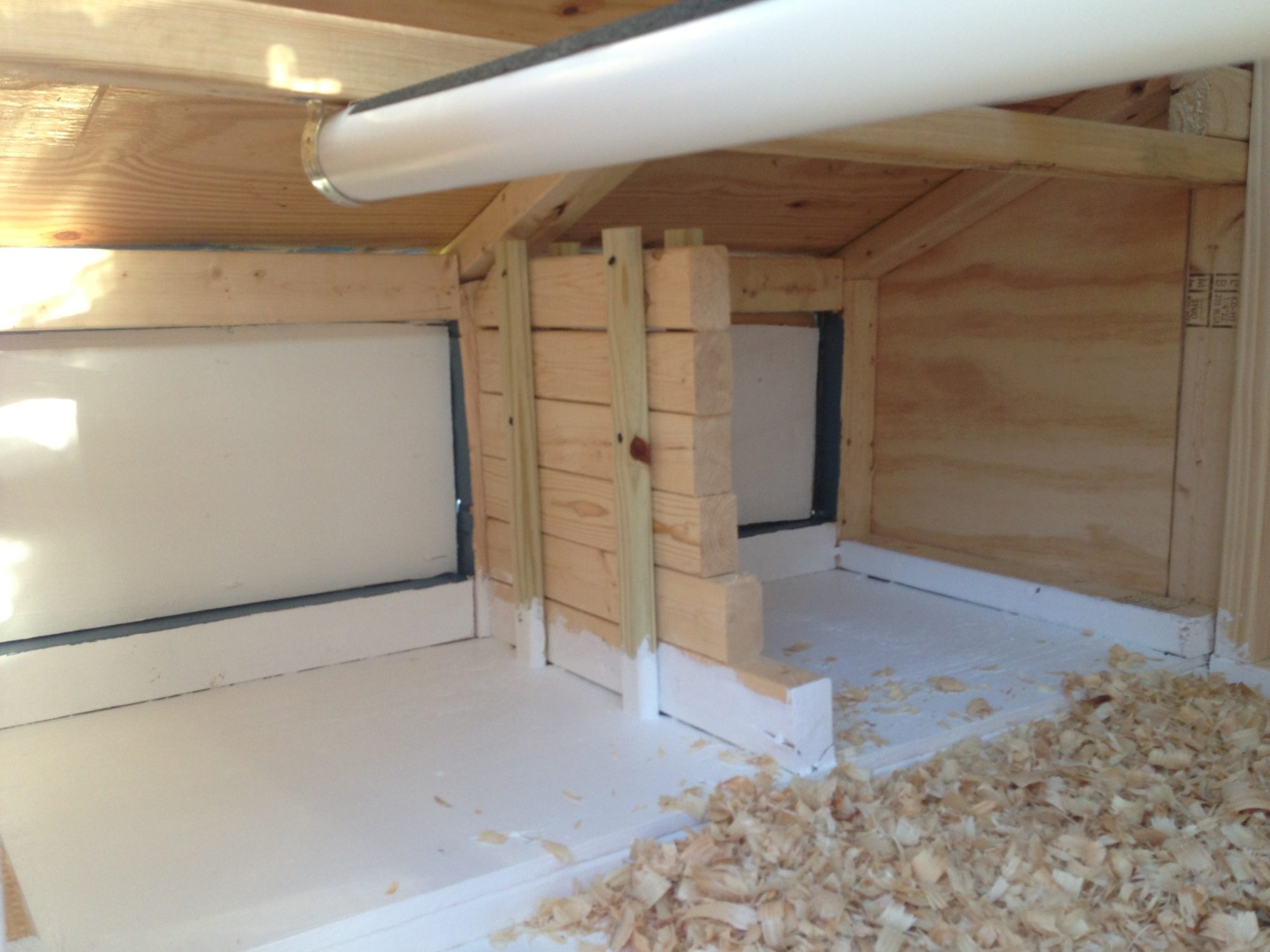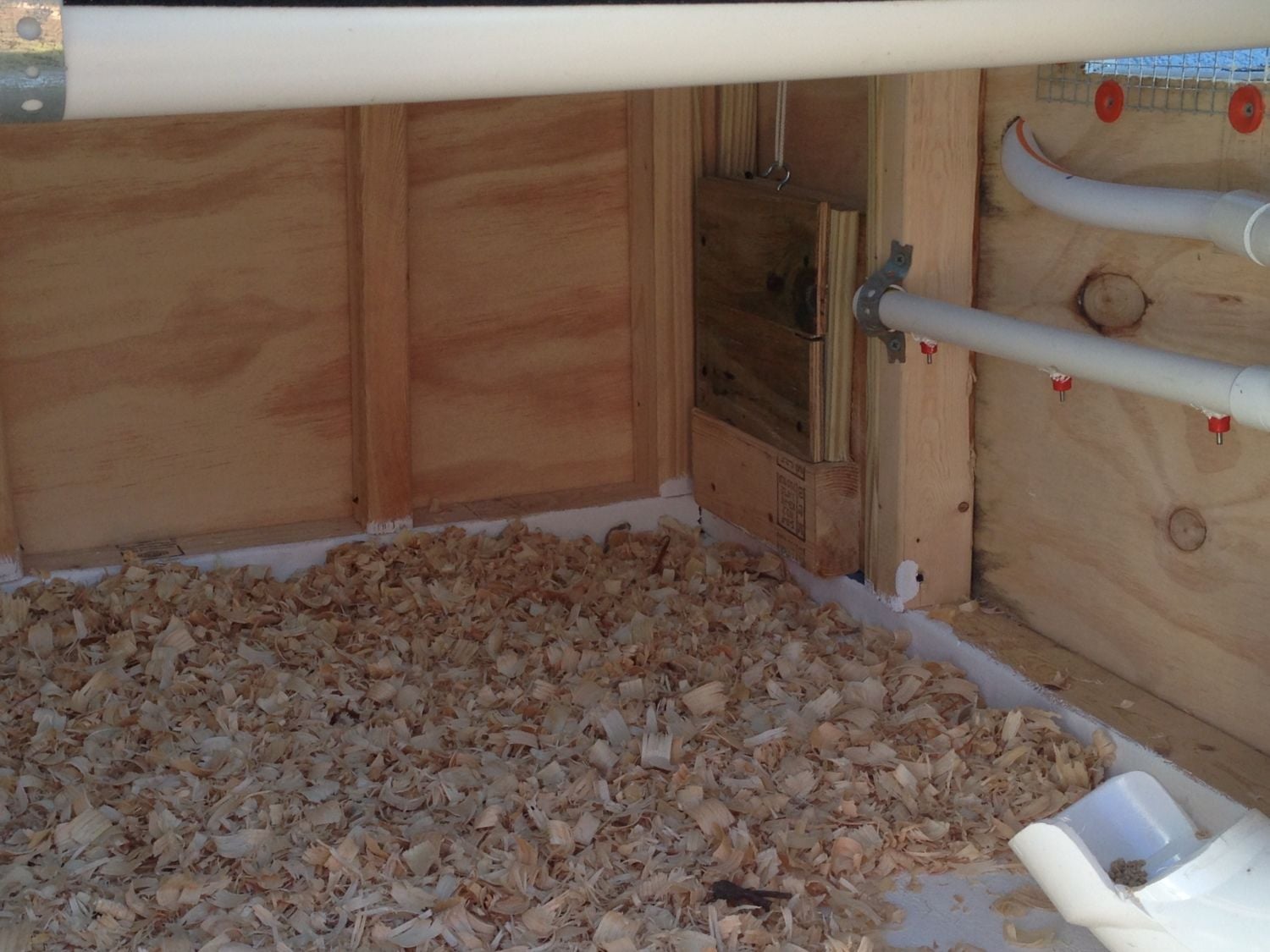 welcome to our coop. We are beginners and never had any kind of livestock before. I started by looking at several different designs on BYC and a took a little bit from many different designs. Our coop/run has 2 watering systems, 1 for inside the coop and 1 for the run and outside the run for when our girls are free ranging. Our girls are only 5 weeks old now and we are training them to use the pins while in the brooder and they are getting the idea of it slowly. The coop is 4x4 and the nesting boxes are 2x2. each. I used 4 inch PVC elbows to make a feeder and cut the top off of one of the elbows to make the feeder opening. there are 2 roosting bars made from 2 inch PVC pipe with grit/no slip tape on top. I made a coop door that is weighed down with lead fishing weights(about 5 pounds worth) with a rope that goes out to the front of the coop with a small boat cleat to tie it down in the up position. The weight from the lead will let the door fall when released. The run has a 4 and a half foot ramp from the coop door. The run is 4x10 plus the 4x4 area under the coop and has a 10x3 herb garden on top which also gives the run tons of shade (which they will need here in central Florida). The 3 doors in the front of the run open up for cleaning and to let the girls out to free range. I will be adding roosting bars to the run soon. The coop and run have cinder blocks buried in the ground under the perimeter to prevent digging predators from getting in. I hope you enjoy viewing our coop!!! I certainly enjoyed building it and I think our girls will love their new home once they are old enough to live in it full-time. All comments and suggestions are welcome. I will be happy to answer any questions you have as well.