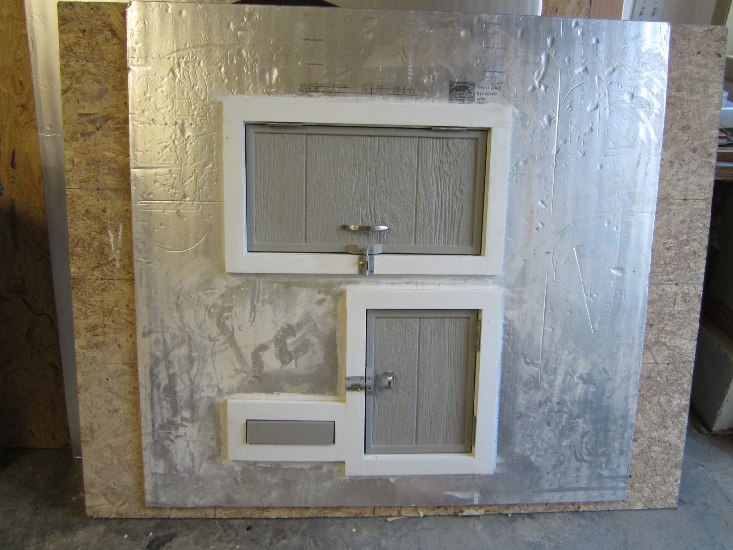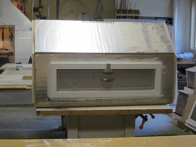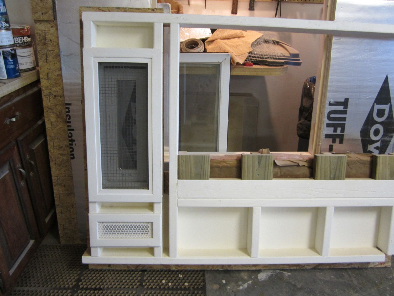 I designed the basic coop on CAD and started construction it my workshop in January. I had chicks coming from BJ's Poultry in March so I need to get a head start. It was to house 6 Coronation Sussex and 3 Birchen Marans. It started out as 5 separate panels that I could assemble in the Spring when outside construction was practical. As you can see in the next photo, some of the panels here are partially trimmed and insulated. When assembled outdoors the remaining insulation, roof trusses,roofing, siding and trim would be put on. It is a 5' x 6' Coop. Below are pictures of components in the shop.