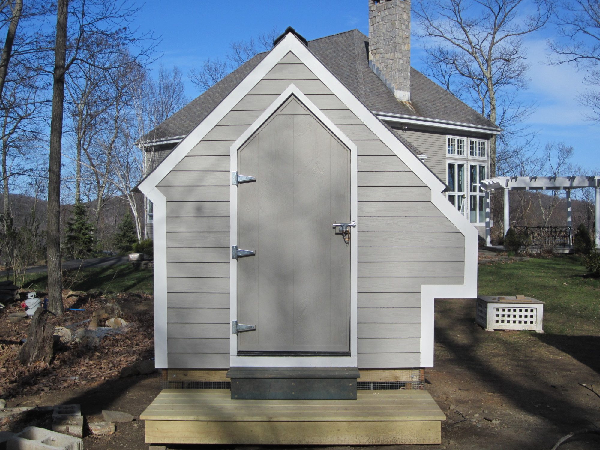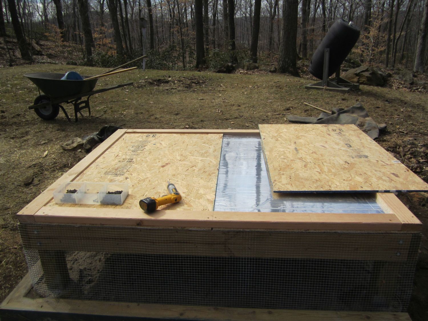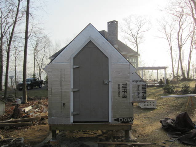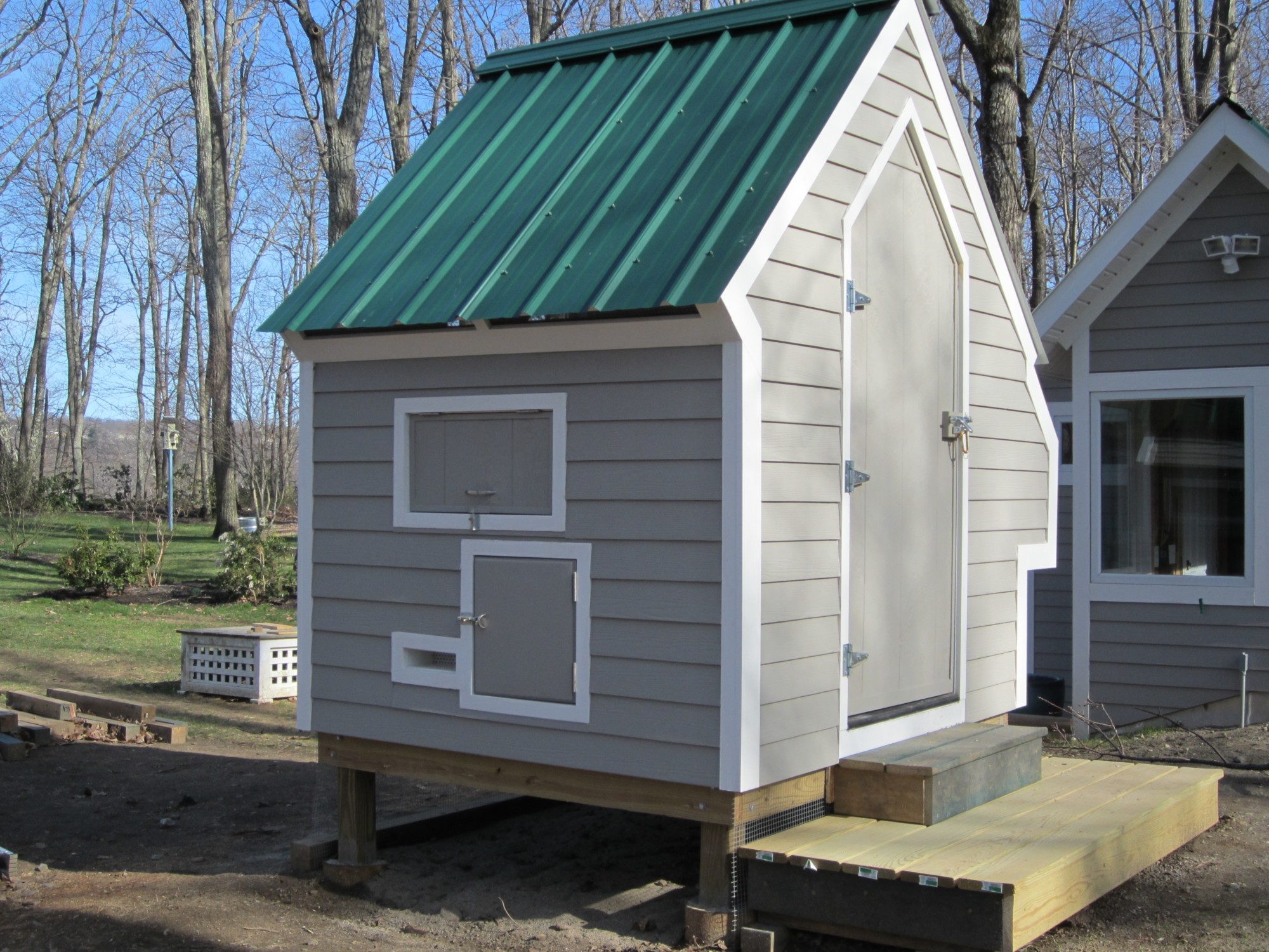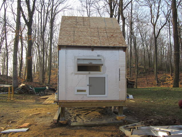 About the end of March early April we were able to get out and my husband and I set up the base. The panels and base were heavy; 2 people were needed for set up. The legs, treated 4 x 4's, are set in concrete footings. There is about a 20 inch clearance between grade and bottom of base. The plan was to give the chickens a place to cool their heels during warm weather. We put about 2-3 inches of sand down before we attached the base of the coop. The coop base is 3 layers: chip ply, 1/2 inch rigid insulation and another layer of ply. The vertical panels were the same materials; 1/2" ply, 1/2" rigid insulation then covered by fiber cement siding. 3 sides of the perimeter around the base is enclosed with 1/2" galvanized welded wire mesh and buried 18". This is Connecticut, it difficult to bury anything 6" deep.