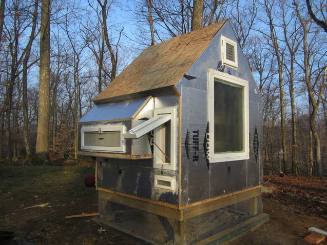After the shell was assembled the remaining trim was added and fiber cement siding was put on along with a standing seam metal roof. Additional ventilation was provided under the eaves. It wasn't in the original plan, but seemed like a good idea since everything I read talked about the importance of ventilation I made inserts (inside) for the eaves so as to close them up as I need to during the colder months. Inside we laid sheet vinyl over the ply. My husband also wired the coop with a light on a timer for Winter months. The adjacent shed has a motion detector light that faces the coop.