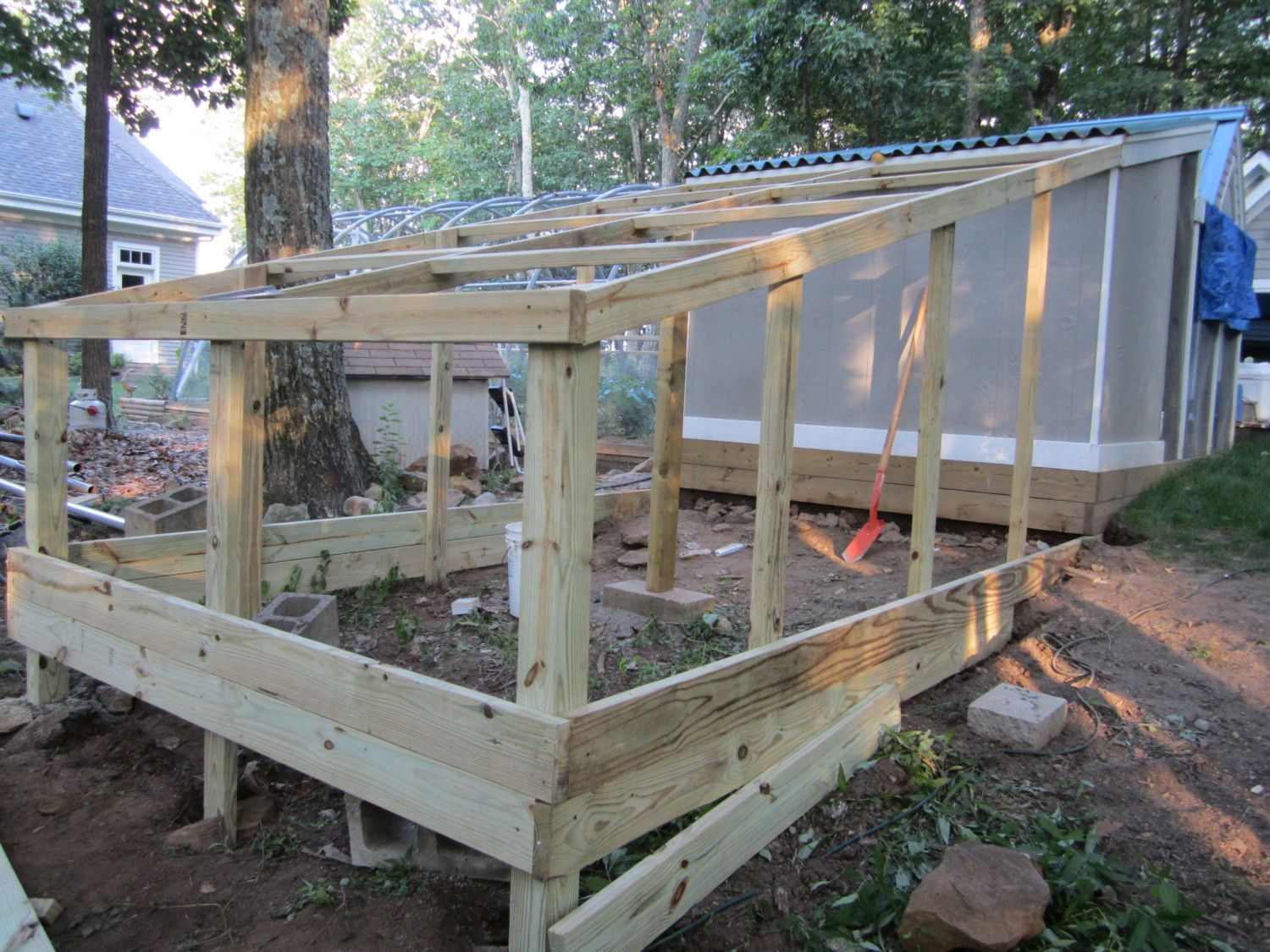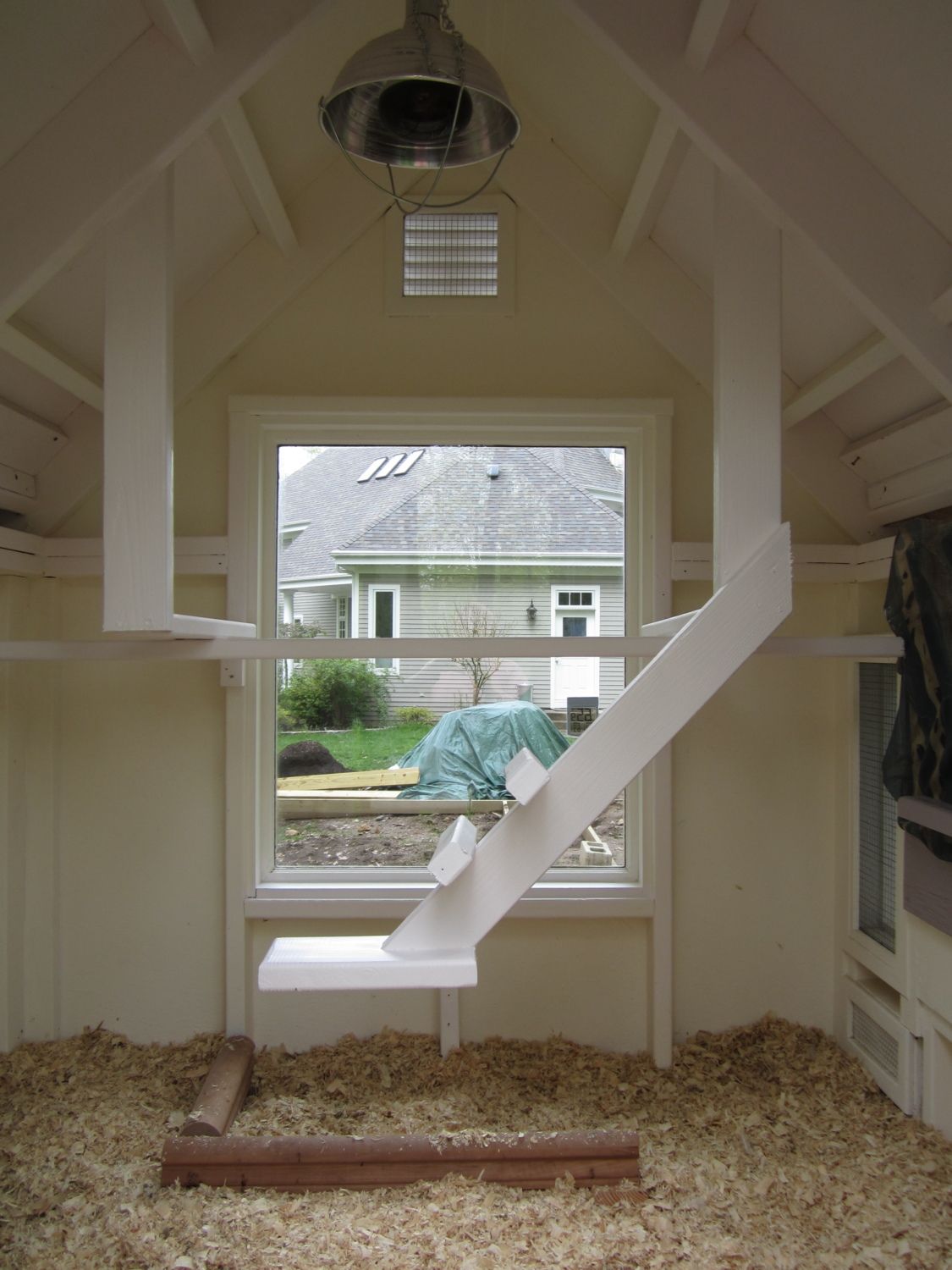 In the Spring I will be figuring out how to roof the area between the coop and covered run. I currently keep a tarp over it to cut down on the heat load. The birds spend a lot of time in the adjacent run addition you will see later, or under the coop. Though it's all open in the run adddtion, there is more shade from trees. I will put up a tarp in the Fall to shed leaves.