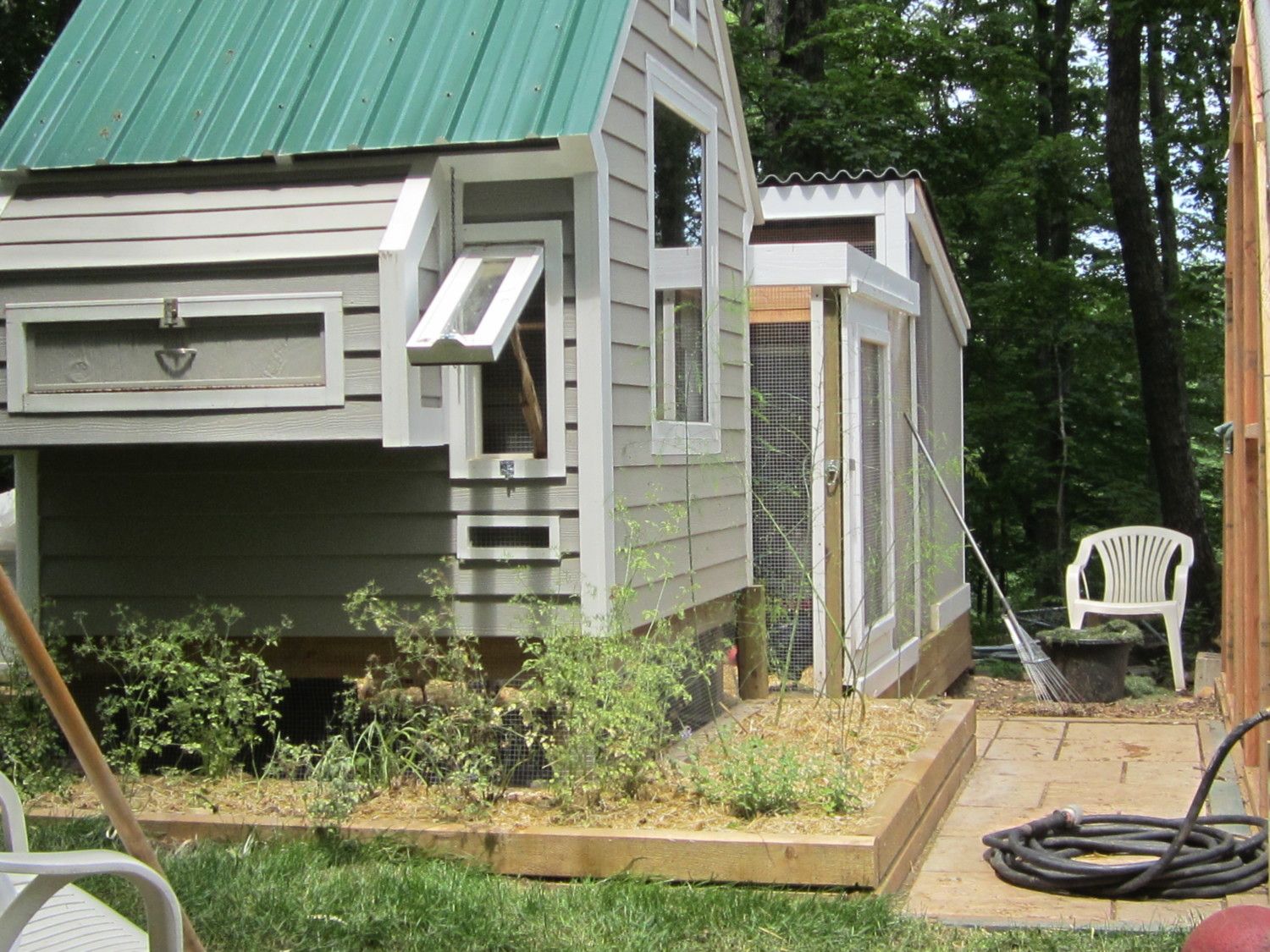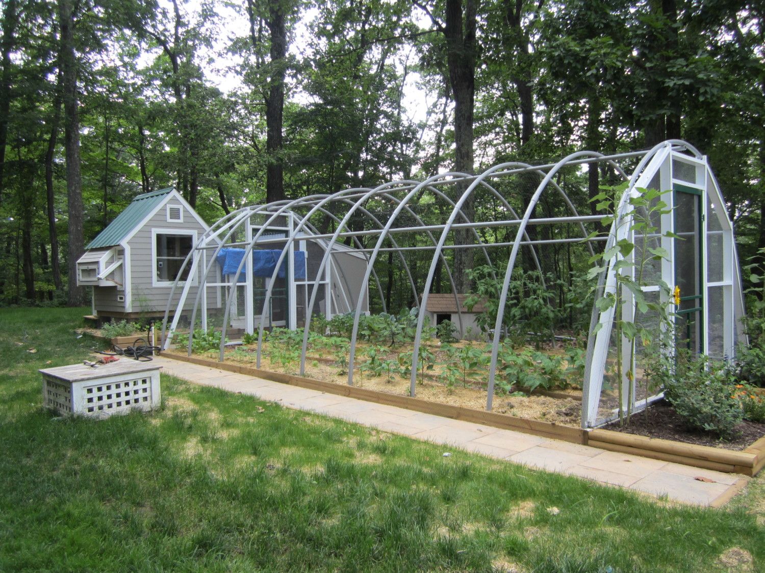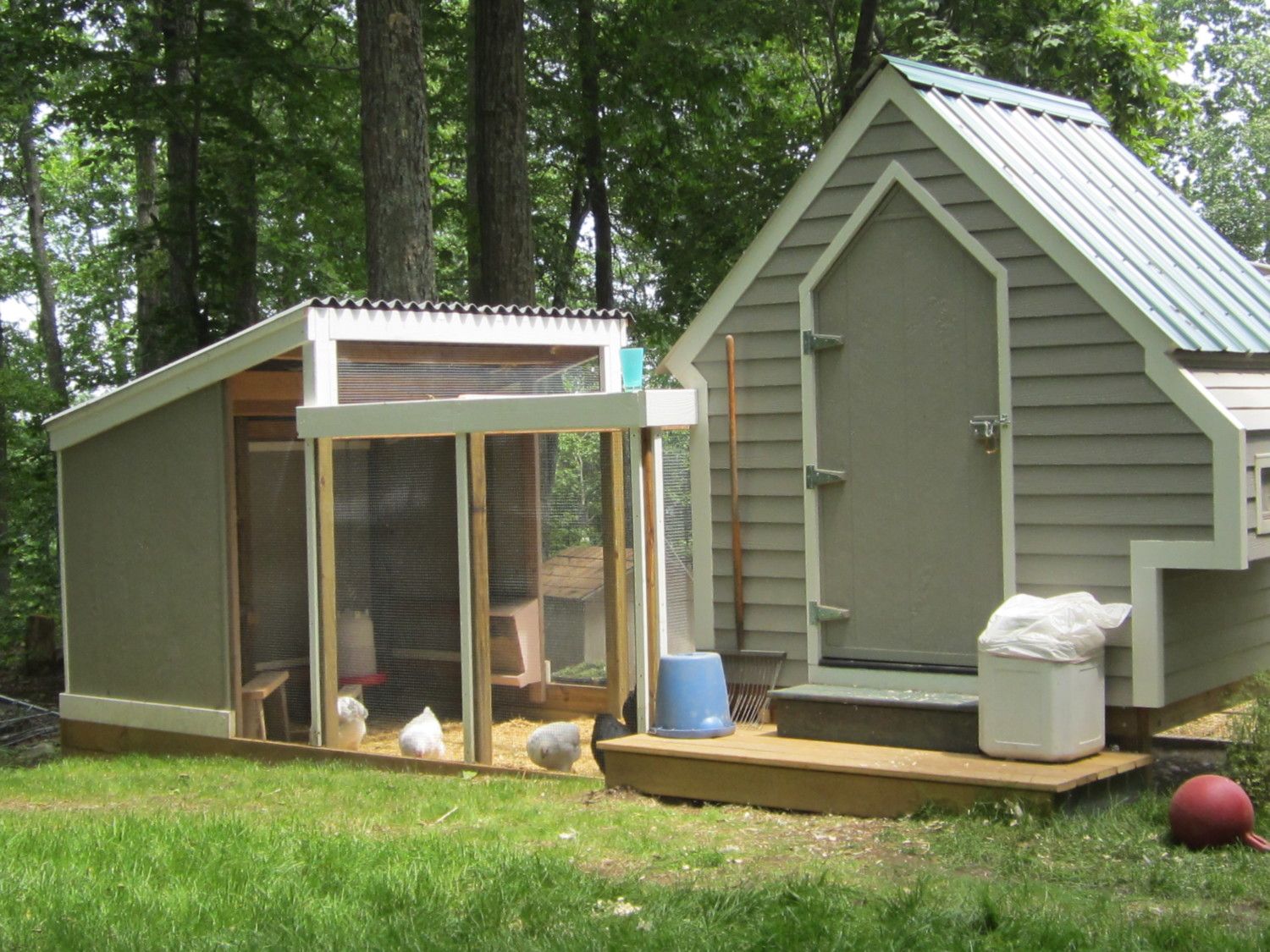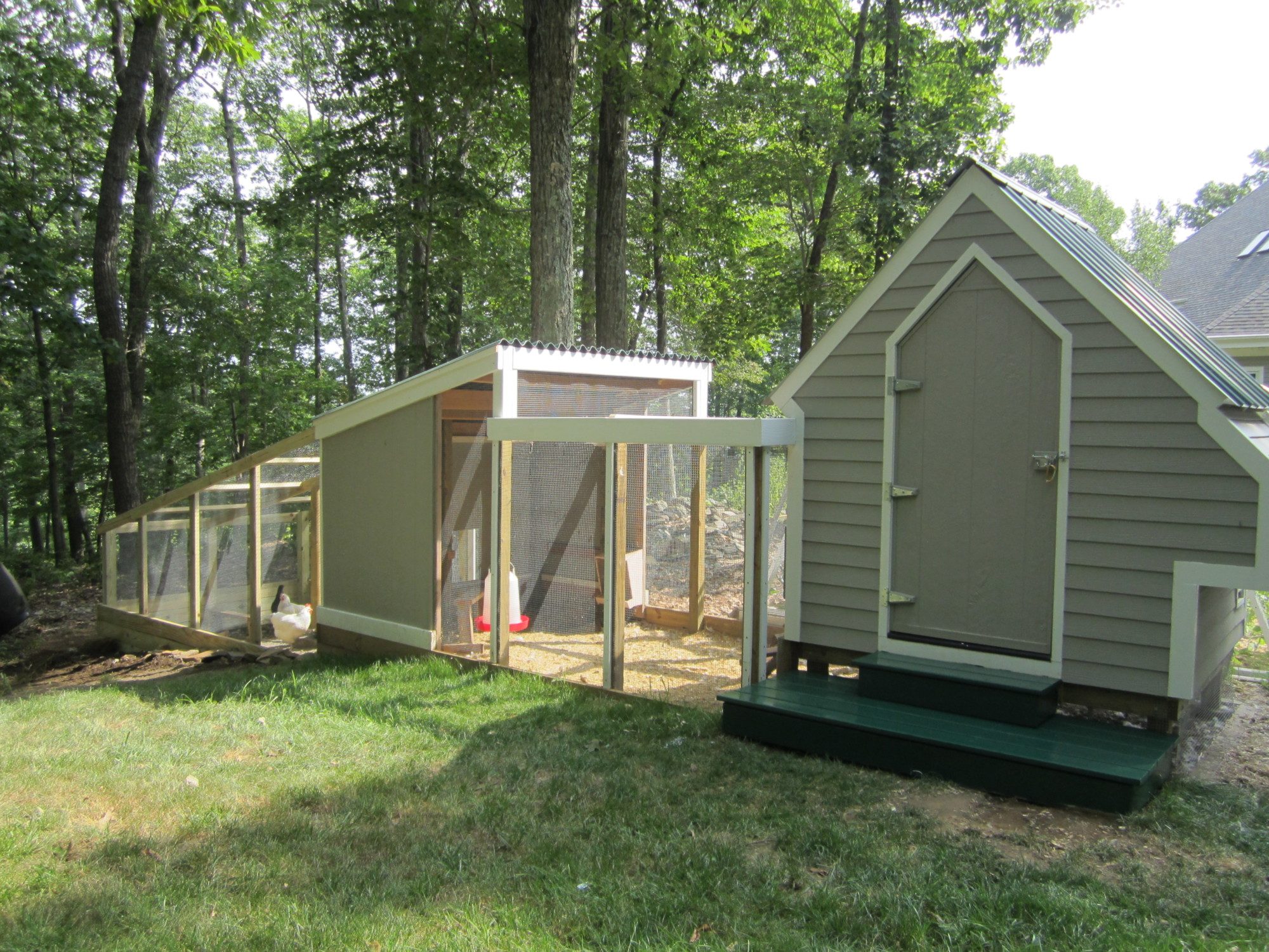 The next step was to put on the run. It is 8' x 12' and partially covered. I wanted to save some money and put Ondura roofing material over a portion of the run. If I were to do it again it would be all covered. Great product, price is right, and installs easily. We painted it to match the metal roof. In the next few days we will be adding another 96 sf to the run as I feel they could use it. The location of the coop and run is at a wooded edge so during at least half the day (after noon) the area is shaded during the summer. So far it had worked out well with the addition of a tarp over the un-roofed part of the run and a fan the birds have fared well during the current heat spell. The run is fully enclosed as we have hawks and fox and such here. I put a sliding door to the run to avoid the space need for a door swing between the run and hoop house. The plan was to add a hoop house adjacent to the coop and run, which we eventually did. The chickens were to get access to it during the Spring and Fall and my vegetable garden would be protected from the chipmunks, deer and woodchucks the have been the bane of my summers. Below is the complete project - minus additional run we added recently.