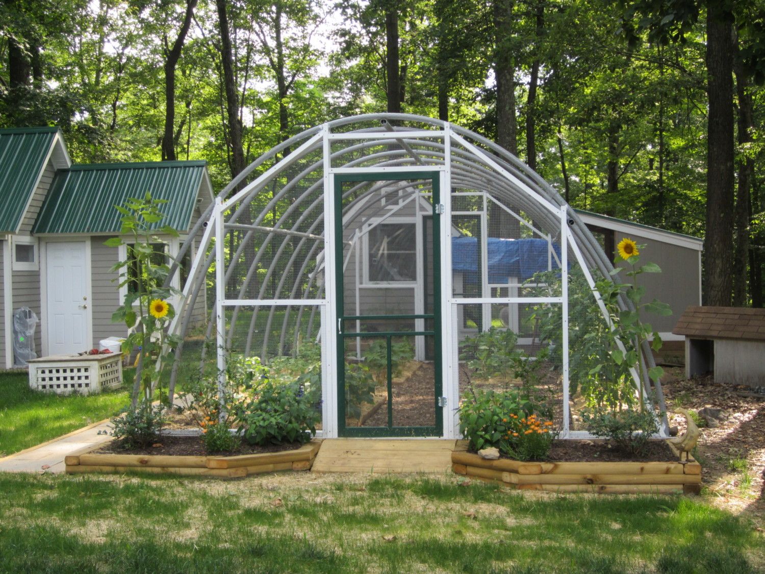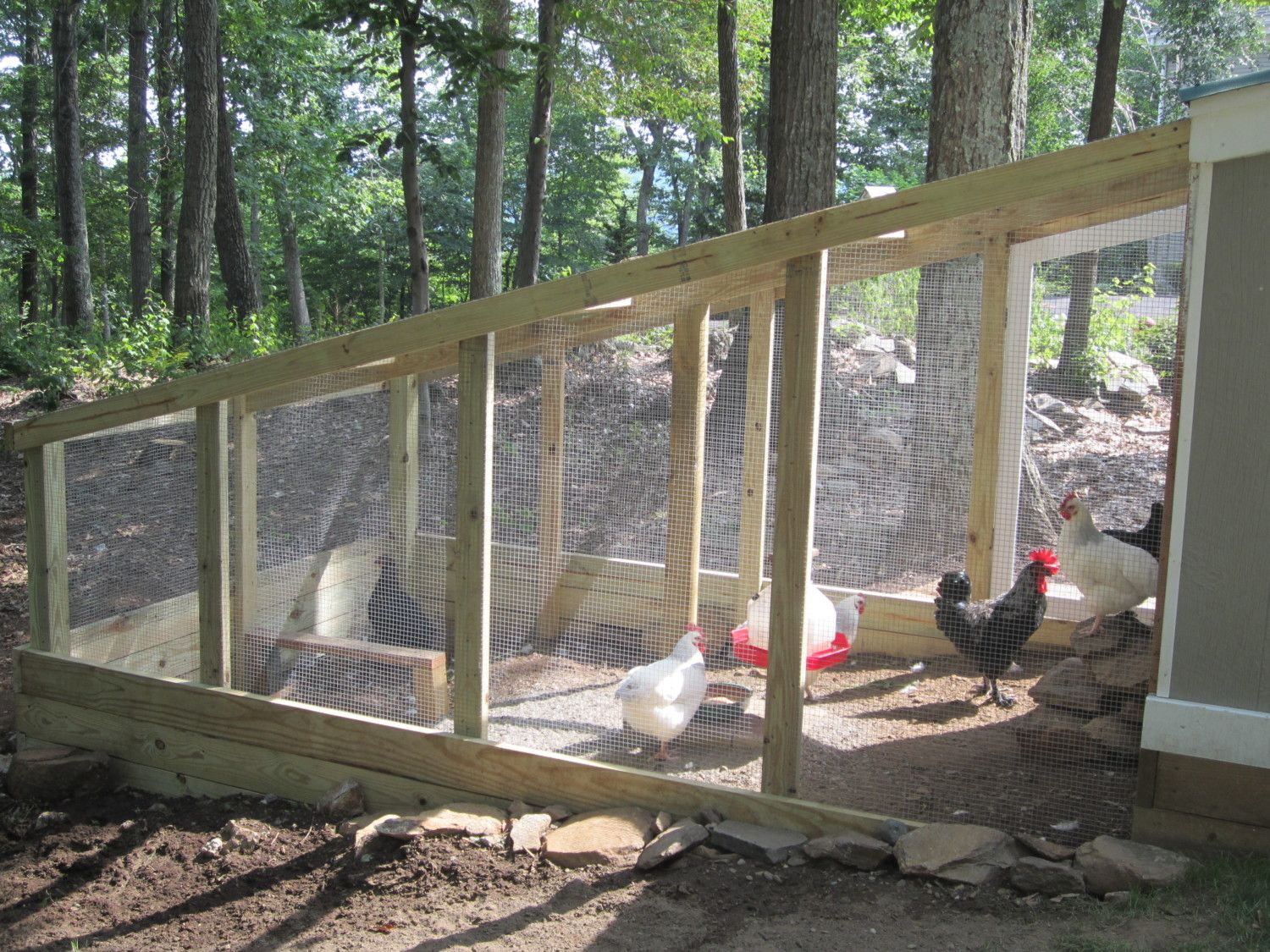 Since these pics were taken I've had to add the 1/2" galvanized welded wire fabric 3 feet up along the long sides of the hoop house as the chipmunks were chewing through the netting. The ends are all welded wire fabric I'll feel a lot better, though, when the birds are in there in the Fall - they will be pretty well protected. I've done some more painting and we finally added the additional run. It is 8' x 12'.