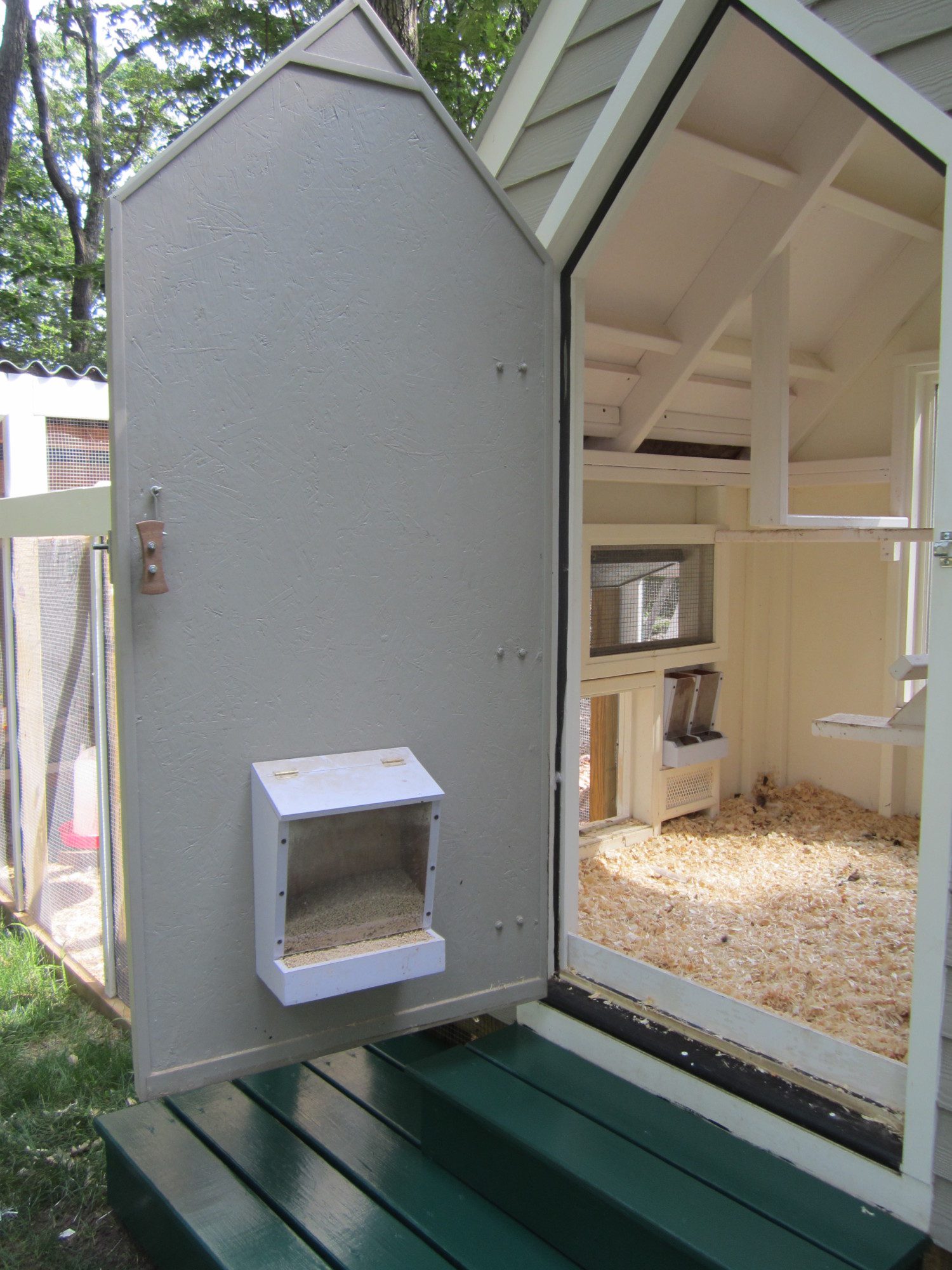 I made a feed box and attached it to the door; it could go higher. Another set of smaller boxes installed between the studs hold grit and oyster shell grit. I tried to free up as much floor space I could.