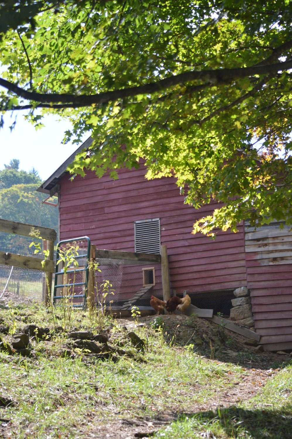 Also hard to see (but there) is that we took off the top two courses of clapboard right under the eaves so that air can escape on this, the south side, and same on the north side. We put hardware cloth over those openings to make Fort Clucks secure.