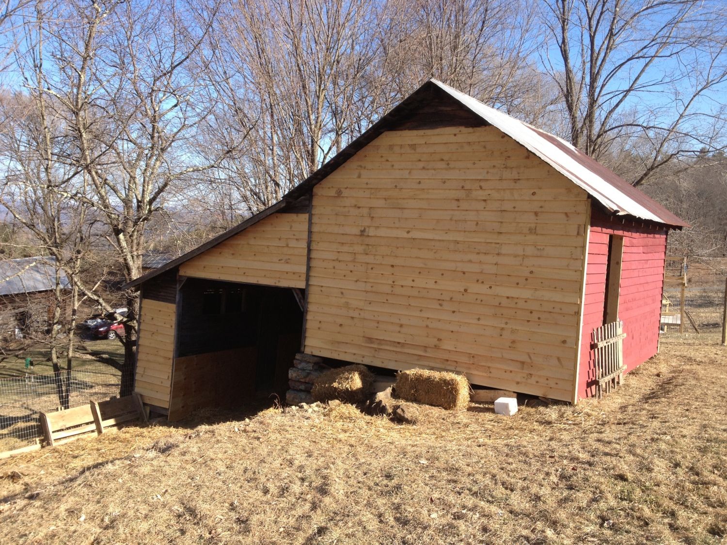 The year after we moved here, I bought a horse. So, we first rehabbed it for horses. The first step was to have it resided. The reason I put these up is so I can explain our ventilation decisions; you need to see it end-on.