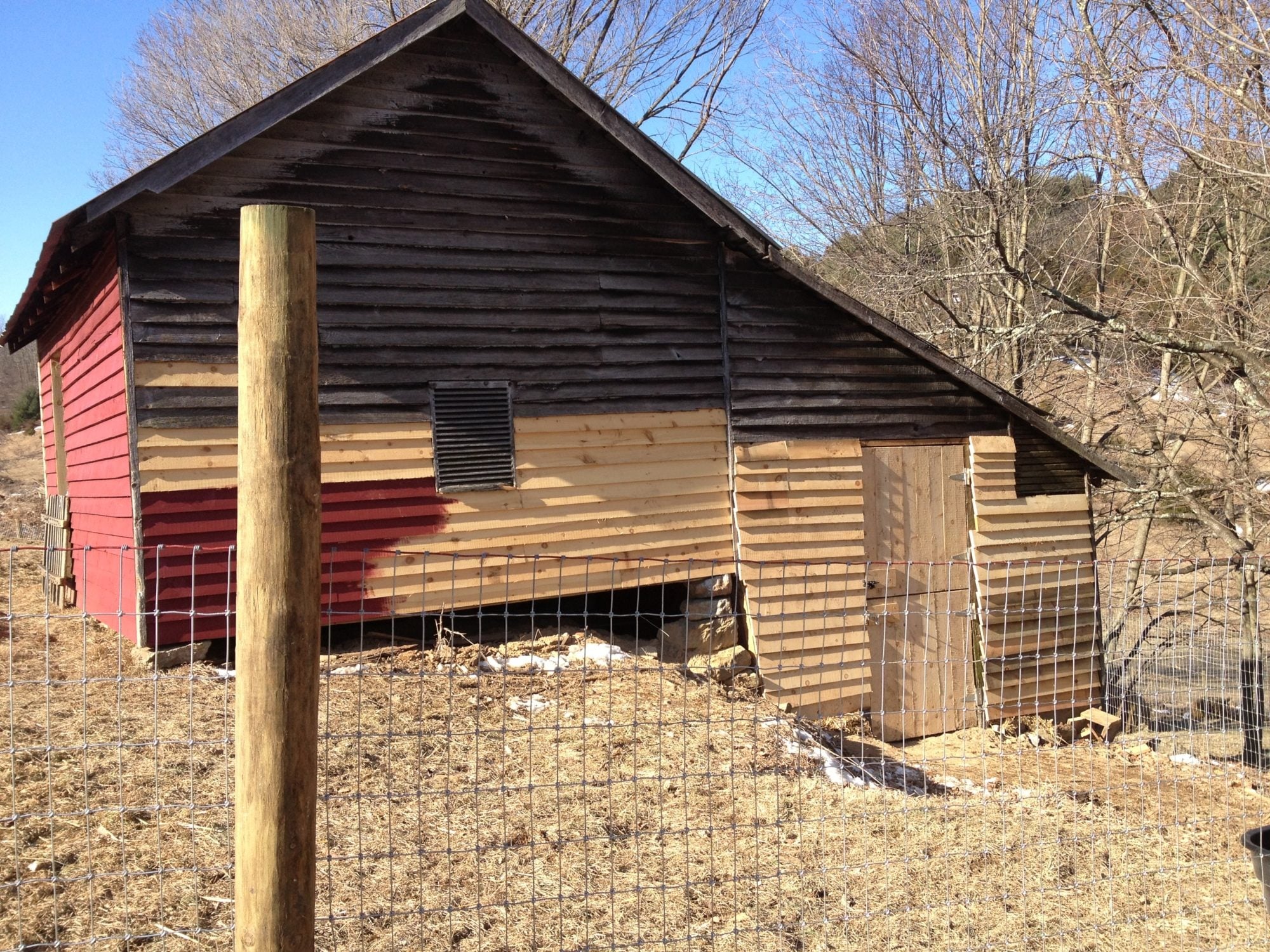 Next to tackle: the south-facing wall. When we did our "quick and dirty" conversion of this building to a coop in June, we took a skill saw to the wall where a doorway HAD been, opened a "window" to the prevailing summer breezes, and stuck some wire up to prevent predators from entering there. THIS is the next frontier. It's the storage area for the coop, and also for the horses while our new barn is being constructed nearby.